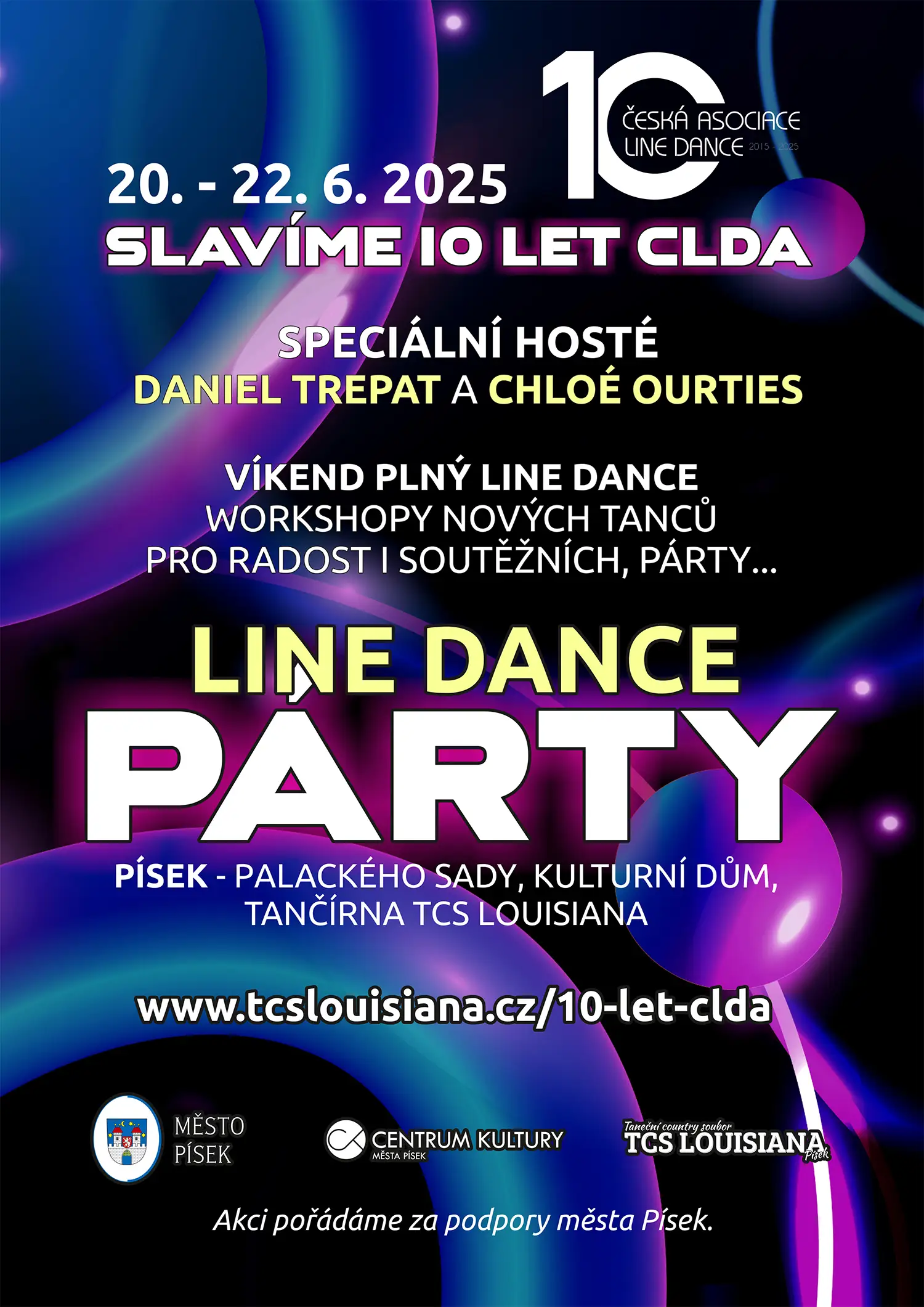 Víkendová výuka Line dance a párty pod vedením zahraničních a domácích lektorů.Podrobný program na https://tcslouisiana.cz/10-let-clda/