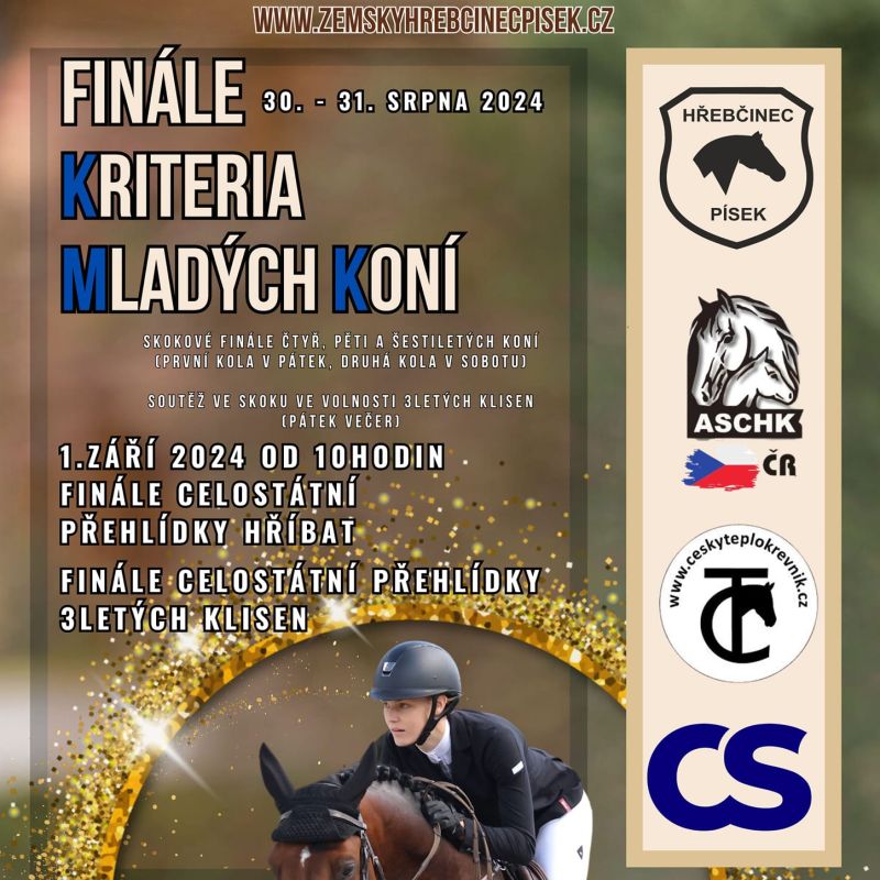 Poslední prázdninový víkend bude v píseckém Zemském hřebčinci patřit závěrečnému SKOKOVÉMU FINÁLE letošního seriálu KRITÉRIA MLADÝCH KONÍ. Program začíná už ve čtvrtek 29. srpna od 12 hodin tréninkovým parkurem. Vlastní soutěž probíhá v pátek a v sobotu 30. – 31. srpna, vždy od 9 hod. do odpoledne v jednotlivých kategoriích KMK pro 4leté, 5leté a 6leté hřebce a valachy a klisny. V pátek je navíc na programu od 19 hod. Soutěž ve skoku ve volnosti 3letých klisen. V neděli 1. září od 10 hod. se v Zemském hřebčinci v Písku uskuteční FINÁLE CELOSTÁTNÍ PŘEHLÍDKY HŘÍBAT A FINÁLE CELOSTÁTNÍ PŘEHLÍDKY 3LETÝCH KLISEN. Akce je volně přístupná veřejnosti, občerstvení zajištěno. Těšíme se na Vaši návštěvu!
