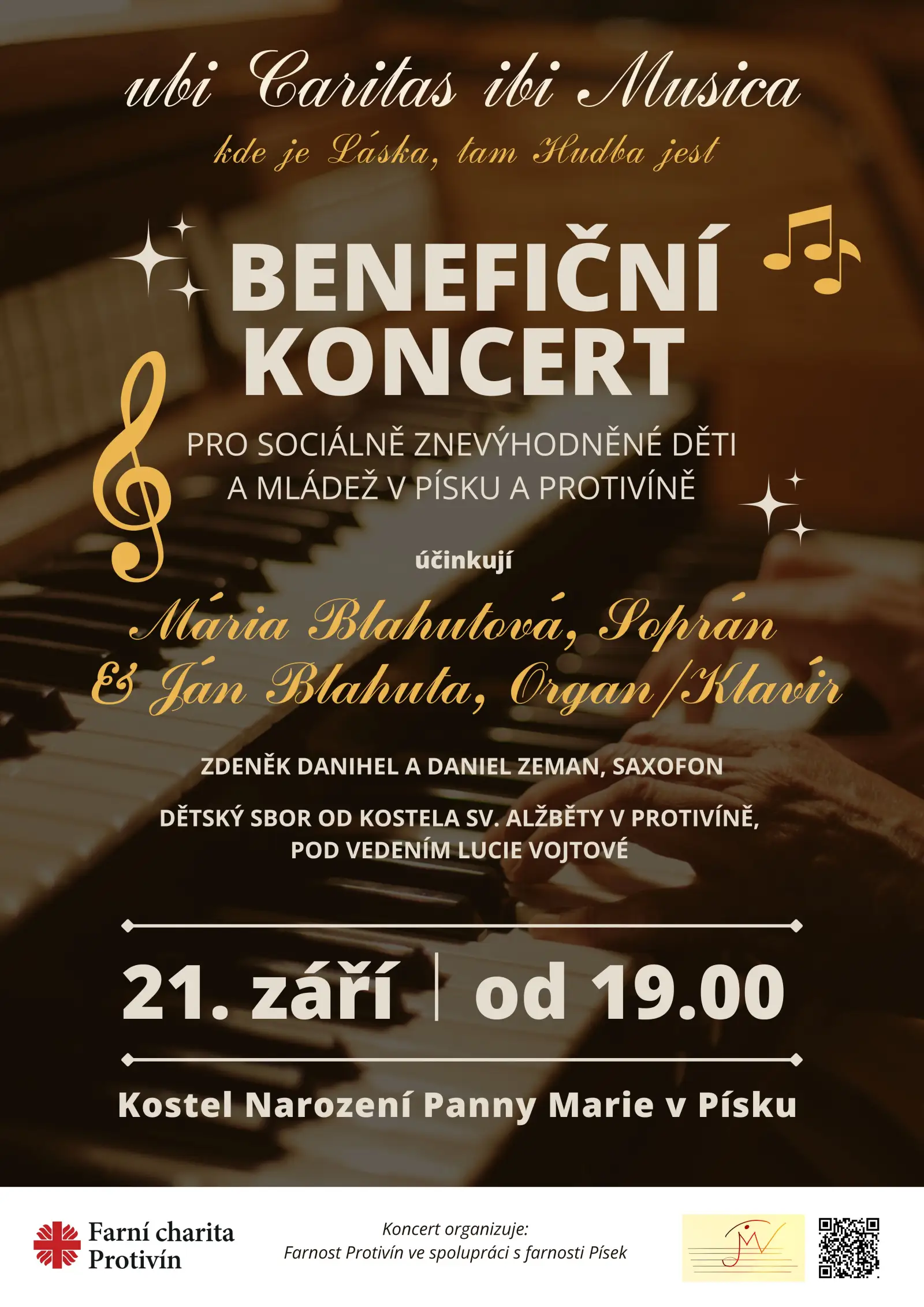 Srdečně Vás zveme tuto neděli na benefiční koncert do Písku. Výtěžek koncertu bude věnován sociálně znevýhodněným dětem u nás v Protivíně a v Písku. Hlavní účinkující Mária a Ján Blahutovi (soprán/klavír), na koncertu vystoupí hosté – Zdeněk Danihel st., Zdeněk Danihel ml. Daniel Zeman a náš dětstký sbor pod vedením Lucie Vojtové.