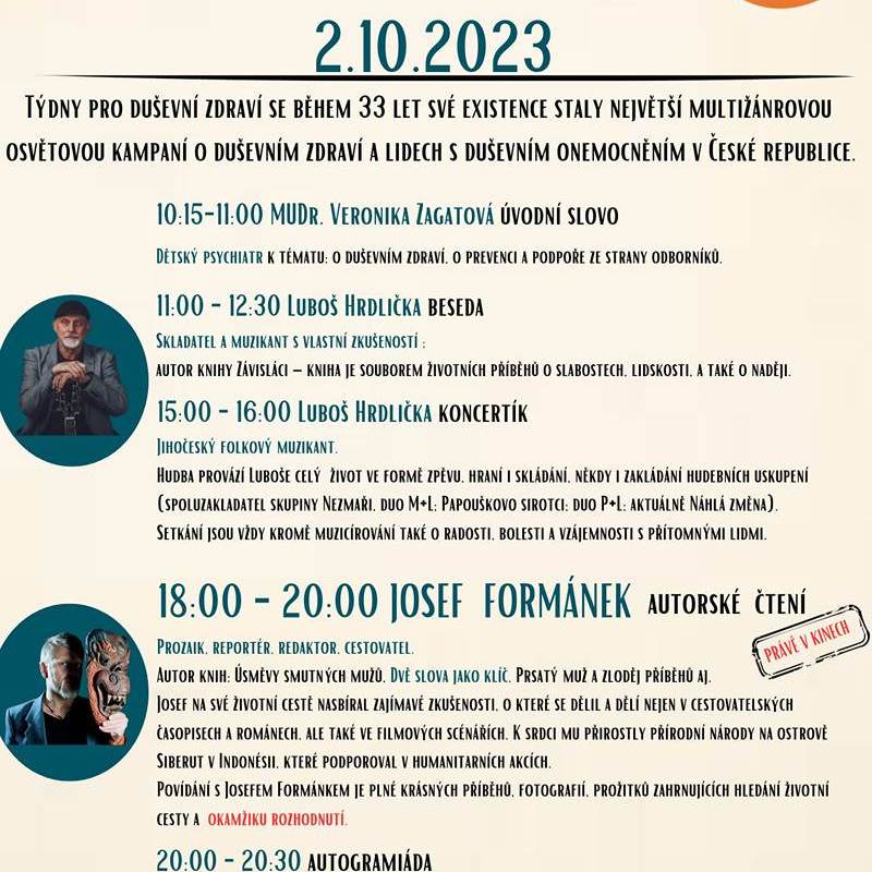 Na cestě kolem duše společně zažijeme besedu s dětskou psychiatričkou MUDr. Veronikou Zagatovou, koncert folkového muzikanta Luboše Hrdličky a autorské čtení Josefa Formánka, autora románů Úsměvy smutných mužů, Dvě slova jako klíč aj.