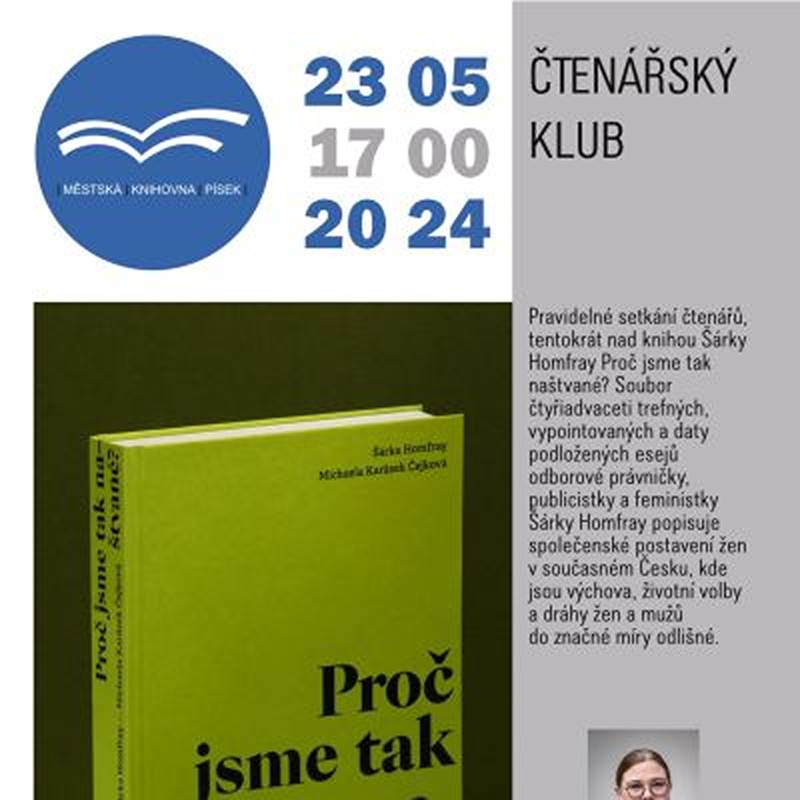 Pravidelné setkání čtenářů nad knihou Šárky Homfray Proč jsme tak naštvané? Soubor čtyřiadvaceti trefných a daty podložených esejů odborové právničky, publicistky a feministky Šárky Homfray popisuje společenské postavení žen v současném Česku, kde jsou výchova, životní volby a dráhy žen a mužů do značné míry odlišné.