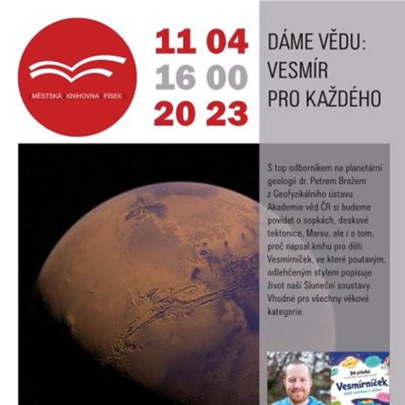 S top odborníkem na planetární geologii dr. Petrem Brožem z Geofyzikálního ústavu Akademie věd ČR si budeme povídat o sopkách, deskové tektonice, Marsu, ale i o tom, proč napsal knihu pro děti Vesmírníček, ve které poutavým, odlehčeným stylem popisuje život naší Sluneční soustavy. Vhodné pro všechny věkové kategorie.