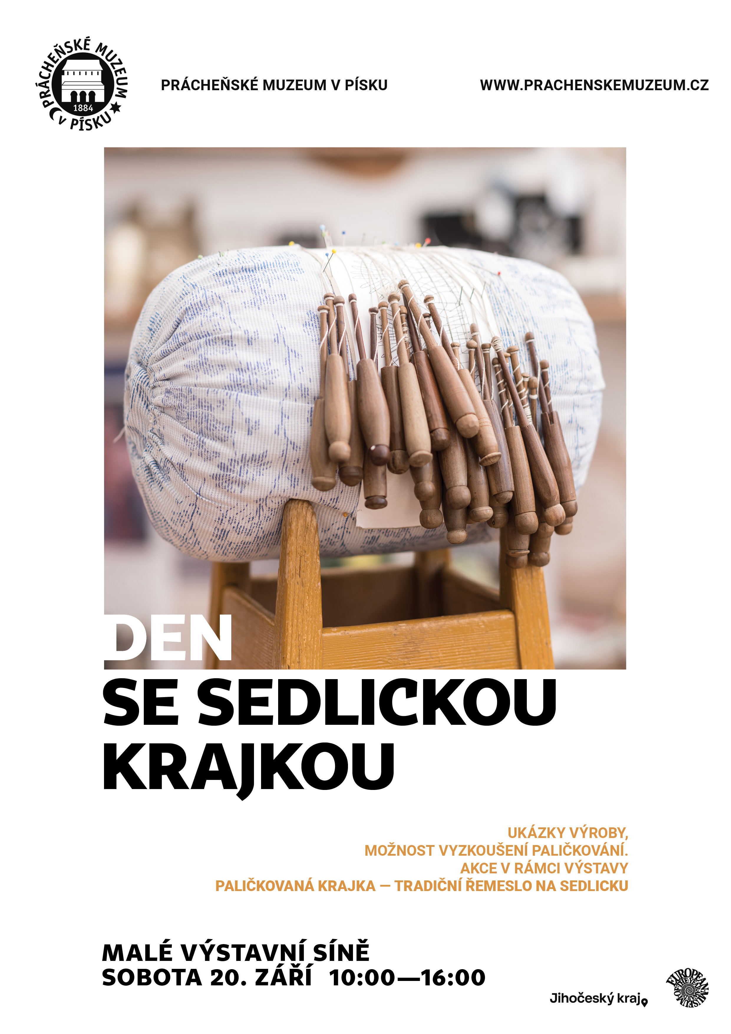 Začátkem srpna Prácheňské muzeum otevřelo výstavu věnovanou sedlické krajce. Skutečně bohatá přehlídka představuje, co všechno dokázaly v minulosti i dnes šikovné ruce vytvořit. A pokud si chcete udělat představu, jak náročná tato práce je, zavítejte do muzea v sobotu 20. září. V čase od 10 do 16 hodin zde Martina Srbová, předsedkyně společnosti Sedlická krajka a autorka výstavy, předvede ukázky výroby a nabídne i možnost řemeslo si vyzkoušet. Nelze však očekávat, že se z vás za jedno odpoledne stane krajkářka – každopádně se lze případně dohodnout na možnosti kurzu, sedlické mistryně svůj um rády předávají dál.