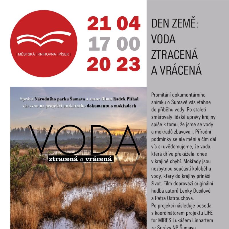 Film doprovází originální hudba autorů Lenky Dusilové a Petra Ostrouchova. Po projekci následuje beseda s koordinátorem projektu LIFE for MIRES Lukášem Linhartem ze Správy NP Šumava. / přednáškový sál