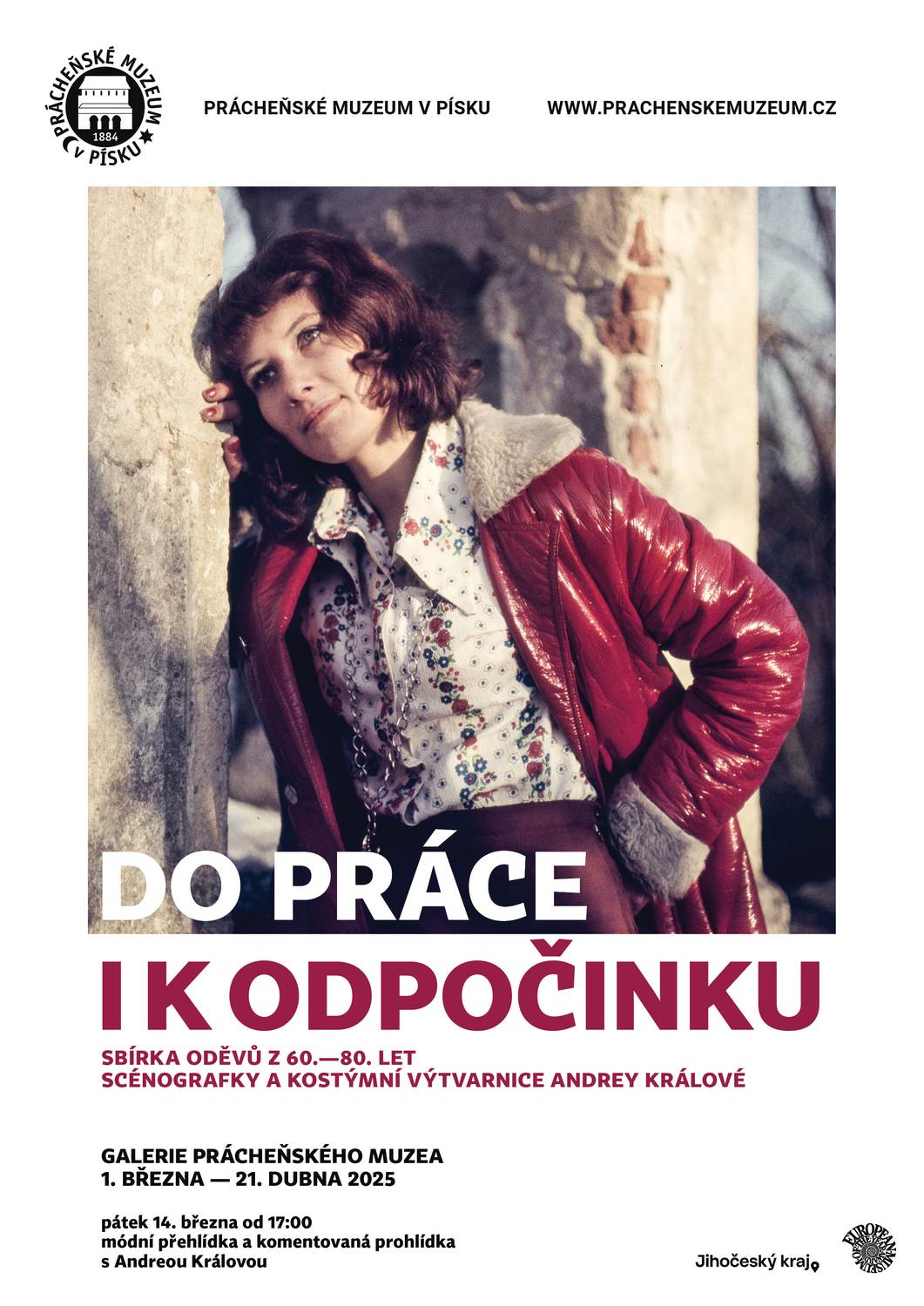 Galerie Prácheňského muzea na jaře 2025 patří parádní „retro“ módě. Svou sbírku oděvů ze 60. – 80. let 20. století zde představuje kostýmní výtvarnice Andrea Králová. Ta byla mnohokrát nominována na Českého Lva a spoluvytvářela podobu řady českých filmů a seriálů (Protektor, Pouta, Já, Mattoni aj.). Vedle filmové produkce vyučuje scénografii a věnuje se volné tvorbě. Za léta práce nashromáždila obrovské množství oděvů, přičemž „šedesátky“ až „osmdesátky“ patří k jejím zvláště oblíbeným. Výstava Do práce i k odpočinku pracuje s dějovou linkou jednoho dne, takže začíná oděvem do práce, pokračuje odpolední vycházkou či sportovní aktivitou a po večerní návštěvě divadla převlékne návštěvníky do nočních úborů. Výstava vznikla v chebském Retromuseu, kde byla poprvé prezentována počátkem loňského roku. Vzhledem k tomu, že Písek díky Jitexu zanechal nesmazatelnou stopu v československé oděvní produkci daného období, rozhodlo se Prácheňské muzeum výstavu rozšířit a reprízovat ve vlastních prostorách. Nebude na ní chybět také fotokoutek s dobovými kostýmy. V pátek 14. 3. v 17 hodin navíc proběhne ve výstavě módní přehlídka a komentovaná prohlídka přímo s Andreou Královou.