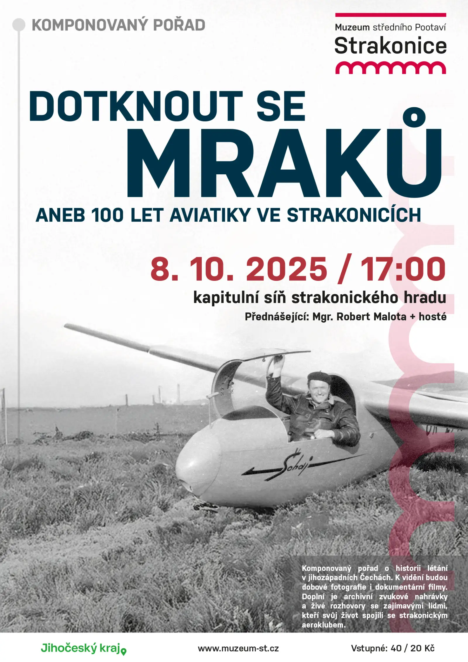 Komponovaný pořad o historii létání v jihozápadních Čechách. K vidění budou dobové fotografie i dokumentární filmy. Doplní je archivní zvukové nahrávky a živé rozhovory se zajímavými lidmi, kteří svůj život spojili se strakonickým aeroklubem.