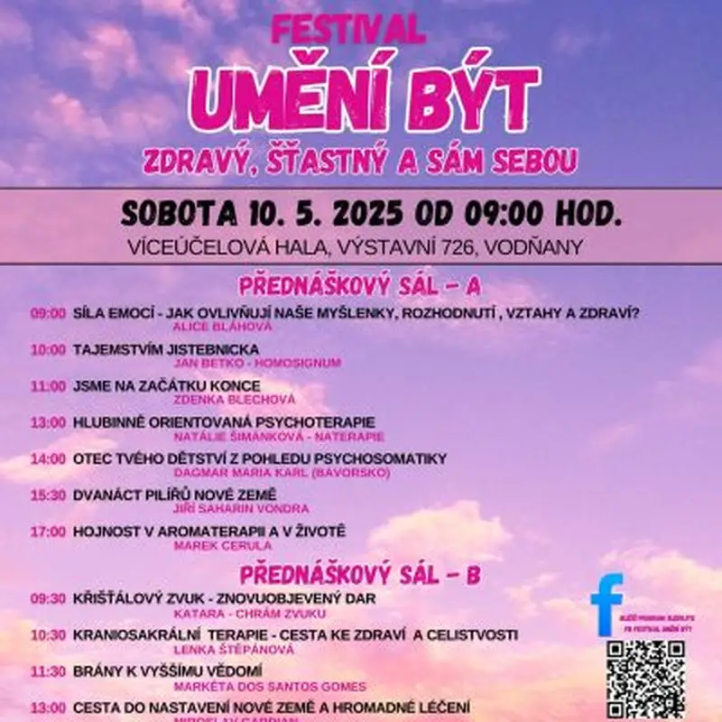 Festival Umění být se uskuteční 10. května ve víceúčelové hale a je zaměřen na alternativní přístupy k životnímu stylu a osobnímu rozvoji. Nabídne řadu inspirativních přednášek, praktických workshopů a možnost setkání se zajímavými osobnostmi z oblasti spirituality, zdravého životního stylu či osobnostního růstu. Akce osloví všechny, kteří hledají nové cesty k harmonickému životu nebo se chtějí seznámit s různými metodami sebepoznání a alternativního přístupu ke zdraví a psychické pohodě.