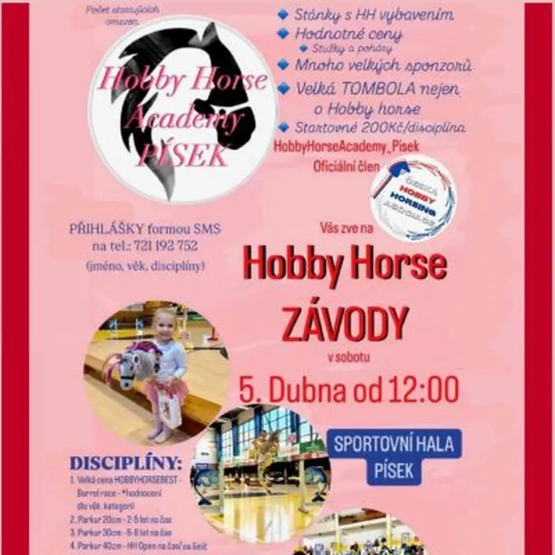 Přihlášky a více informací najdete na Facebooku a Instagramu (zavináč) HobbyHorseAcademy_Pisek nebo na telefonu 721 192 752.