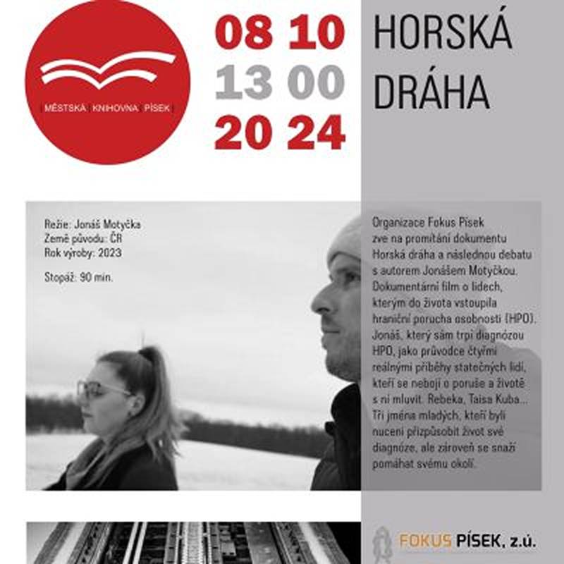 Organizace Fokus Písek zve na promítání dokumentu Horská dráha a následnou debatu s autorem Jonášem Motyčkou. Dokumentární film o lidech, kterým do života vstoupila hraniční porucha osobnosti.Pozvánka knihovny, Promítání