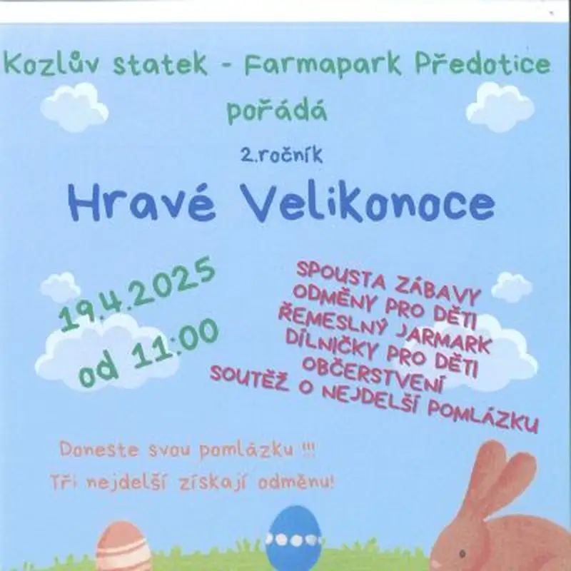 Přijďte si užít den plný zábavy. Těšit se můžete na plnění úkolů, dárky pro děti, občerstvení a zvířátka. Chybět zde nebude řemeslný jarmark. Doma si nezapomeňte pomlázku, tři nejdelší vyhrají cenu.