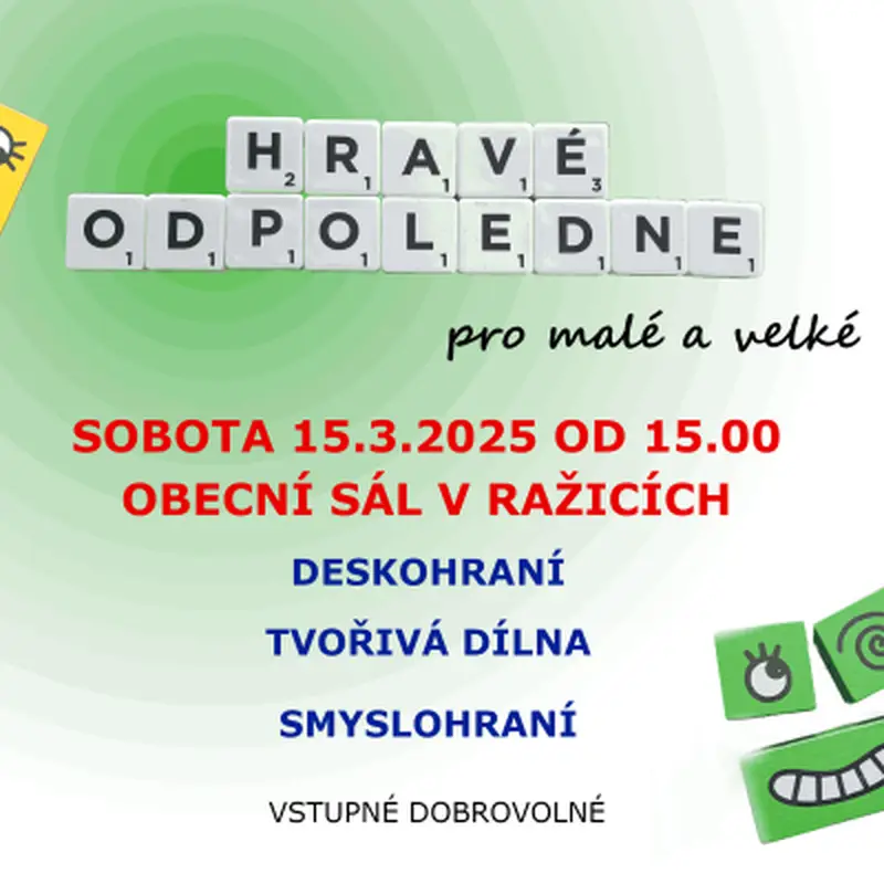 Zveme všechny na HRAVÉ ODPOLEDNE, které se koná v sobotu 15. března od 15 hodin v obecním sále v Ražicích. Těšit se můžete na hry, tvoření a zábavu. Vstupné je dobrovolné.