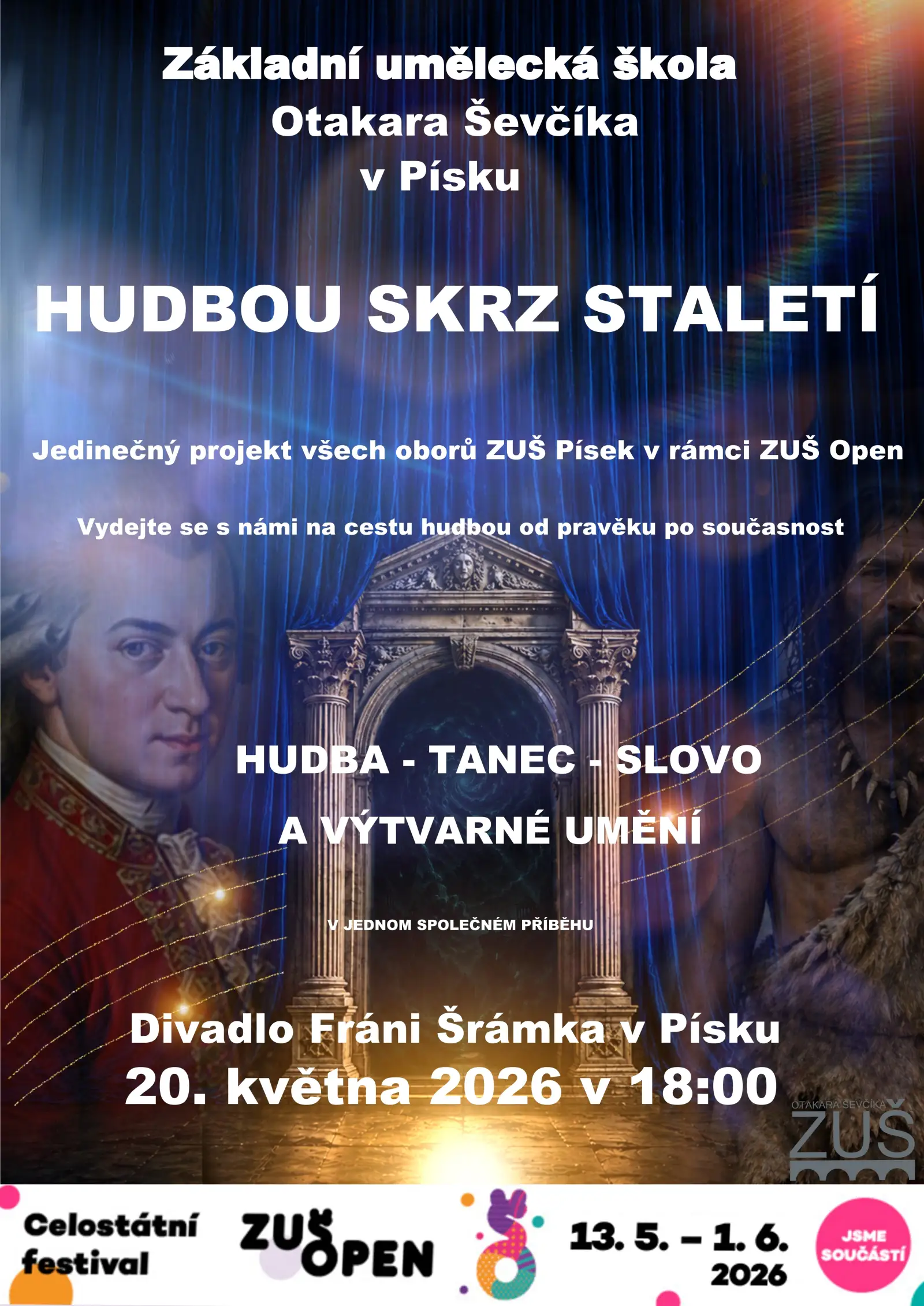 Popis akce: Projekt všech čtyř oborů naší ZUŠ – hudebního, výtvarného, tanečního a literárně-dramatického – nabídne jedinečný pohled na hudbu v proměnách času. Společně vás provedeme hudbou od pravěku až po současnost a ukážeme, jak se spolu s plynutím času proměňuje její podoba, výraz i způsob vnímání. Čeká vás večer, v němž se propojí hudba, pohyb, slovo i výtvarná tvorba v jeden společný příběh.