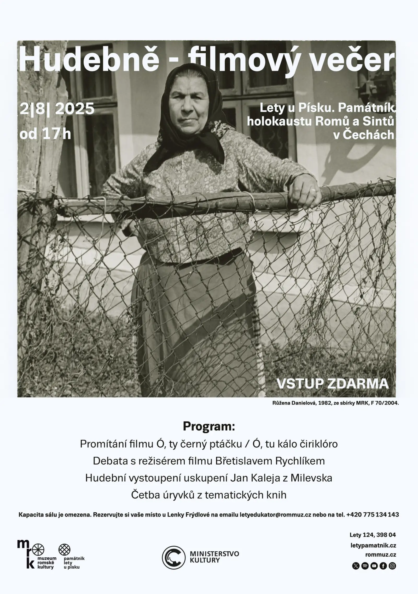 Hudebně-filmový večer při příležitosti připomínky Dne obětí romského holokaustu se koná 2.8. od 17:00.