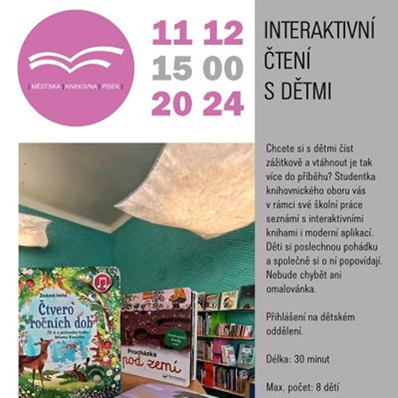 Studentka knihovnického oboru vás v rámci své školní práce seznámí s interaktivními knihami i moderní aplikací. Děti si poslechnou pohádku a společně si o ní popovídají. Délka: 30 minut. Max. počet: 8 dětí. Věk: 3-6 let. Přihlášení na dětském oddělení.