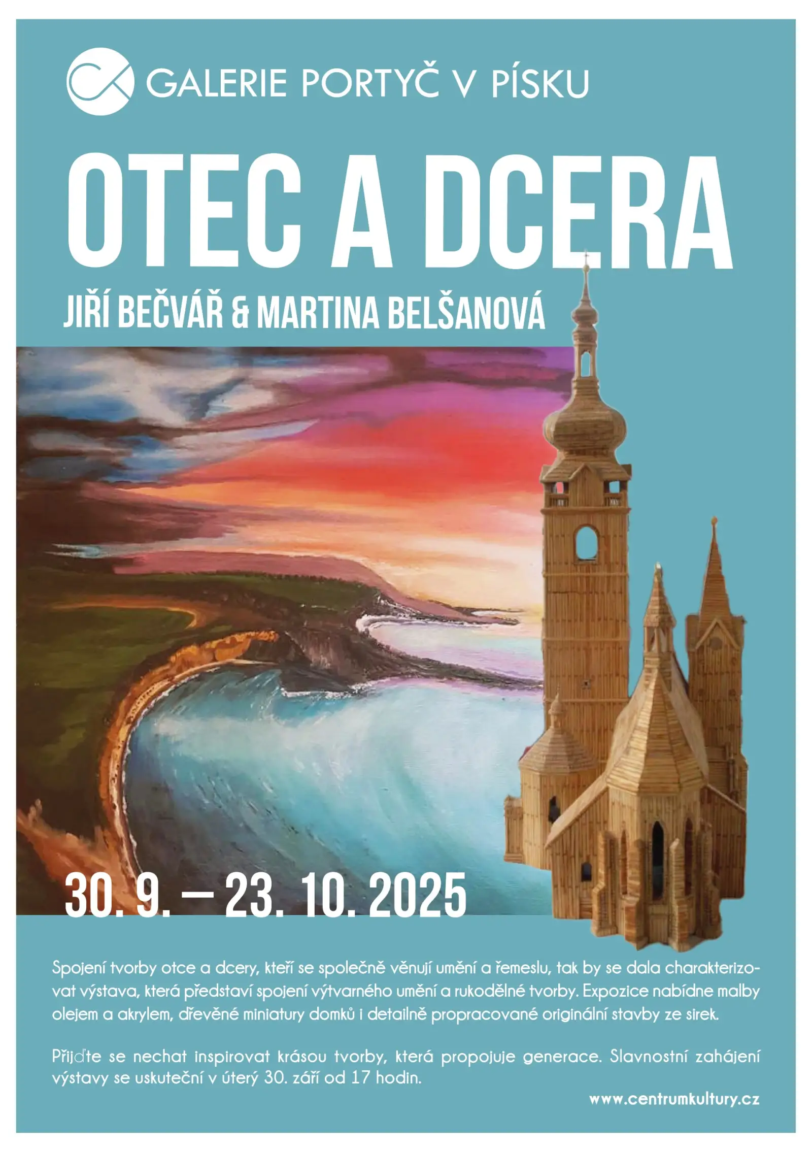 Pod společným názvem Otec a dcera představují autoři výběr své tvorby, jež propojuje výtvarné umění s rukodělnou zručností a uměleckým citem. Expozice nabídne olejomalby a akrylové obrazy, dřevěné miniatury domků a především originální stavby vytvořené ze sirek, které zaujmou svou precizností i nápaditostí.