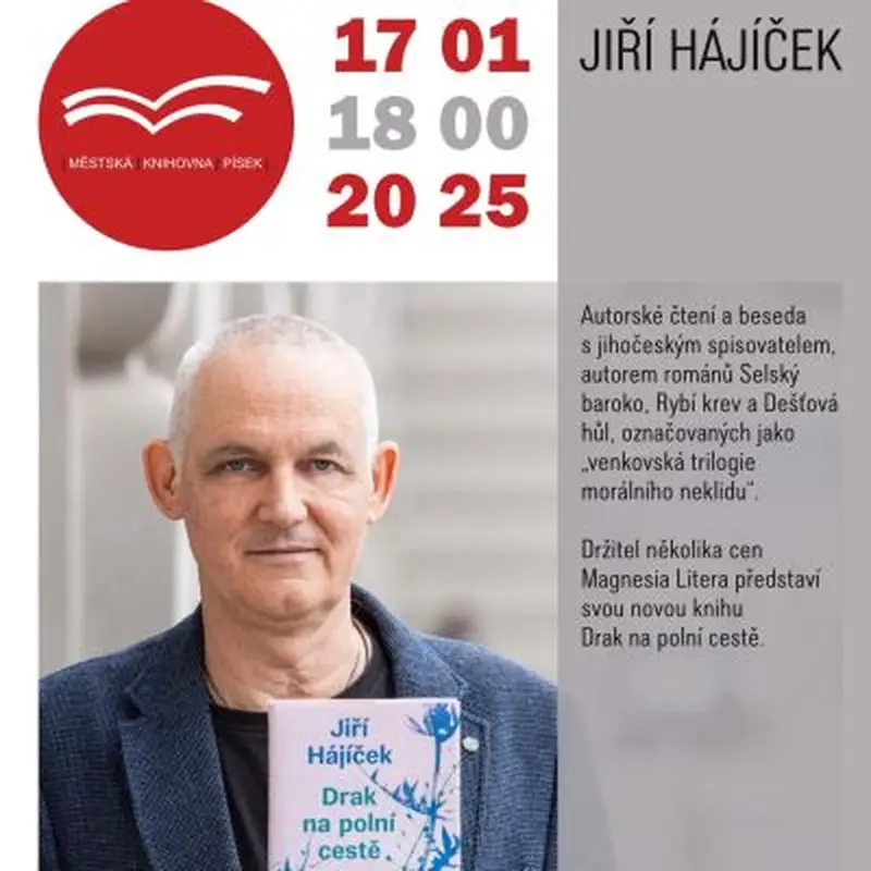 Autorské čtení a beseda s jihočeským spisovatelem, autorem románů Selský baroko, Rybí krev a Dešťová hůl, označovaných jako „venkovská trilogie morálního neklidu“. Držitel několika cen Magnesia Litera představí svou novou knihu Drak na polní cestě.