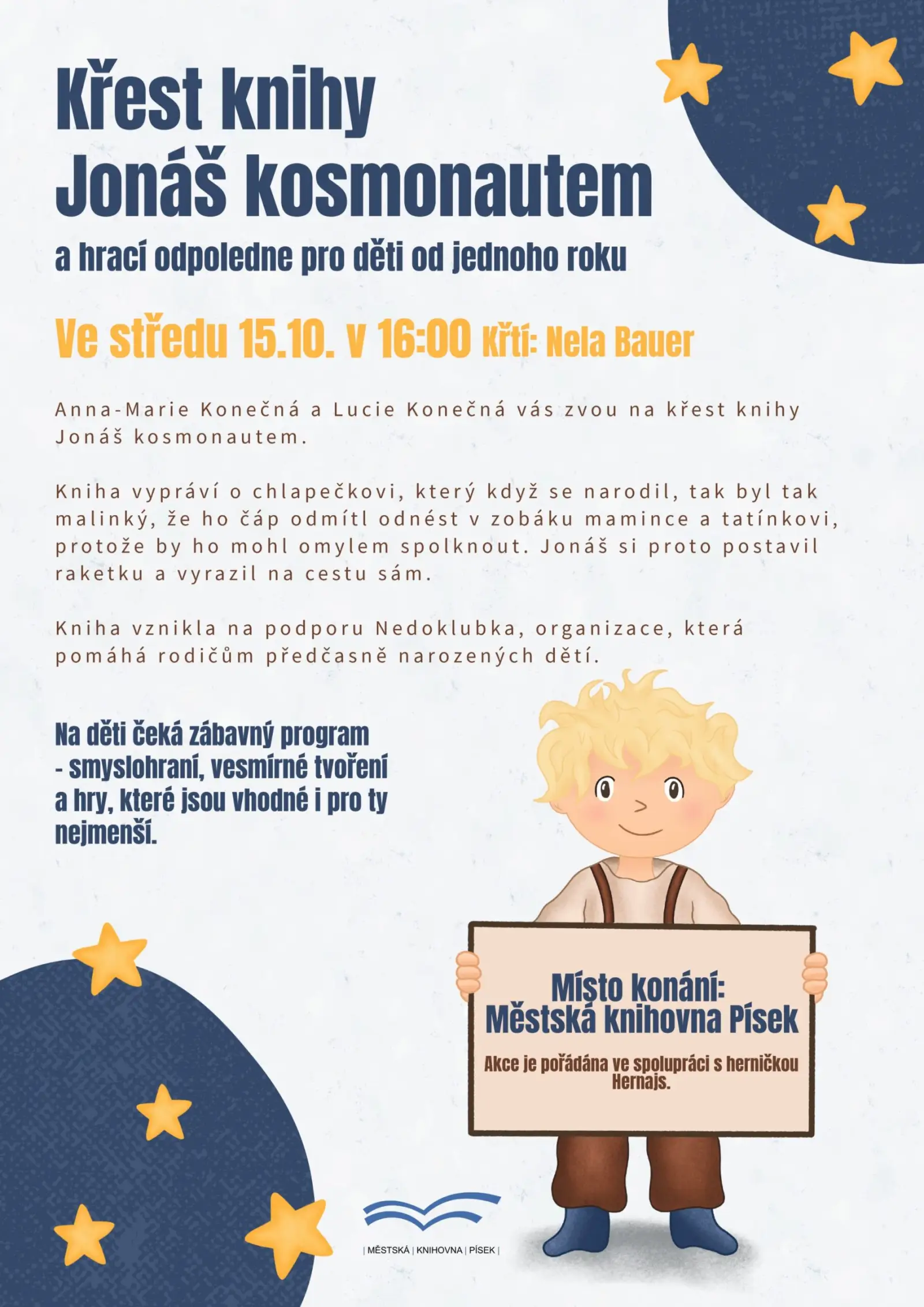 Křest pohádkové knihy podle skutečného příběhu malého bojovníka. Kniha Jonáš kosmonautem byla vydána jako podpora organizaci Nedoklubko, která pomáhá rodinám předčasně narozených dětí.