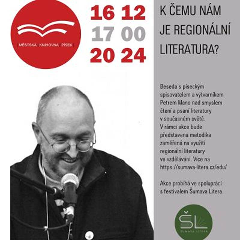 Beseda s píseckým spisovatelem a výtvarníkem Petrem Mano nad smyslem čtení a psaní literatury v současném světě. V rámci akce bude představena metodika zaměřená na využití regionální literatury ve vzdělávání. Více na https://sumava-litera.cz/edu/ Akce probíhá ve spolupráci s festivalem Šumava Litera.