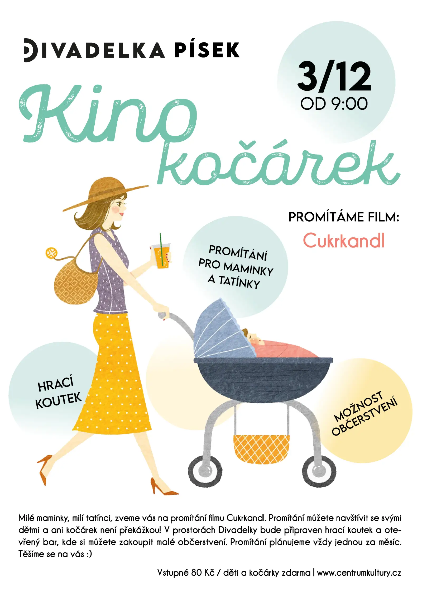 Milé maminky, milí tatínci, zveme vás do Divadelky na promítání rodinného filmu Cukrkandl. Promítání se můžete zúčastnit i se svými dětmi a ani kočárek není překážkou! V prostorách Divadelky je pro ty nejmenší hrací koutek, ve kterém máme připravené židličky a další hračky. Pro rodiče bude otevřený bar, kde si můžete zakoupit malé občerstvení. Promítání je vždy jednou za měsíc. Těšíme se na vás.