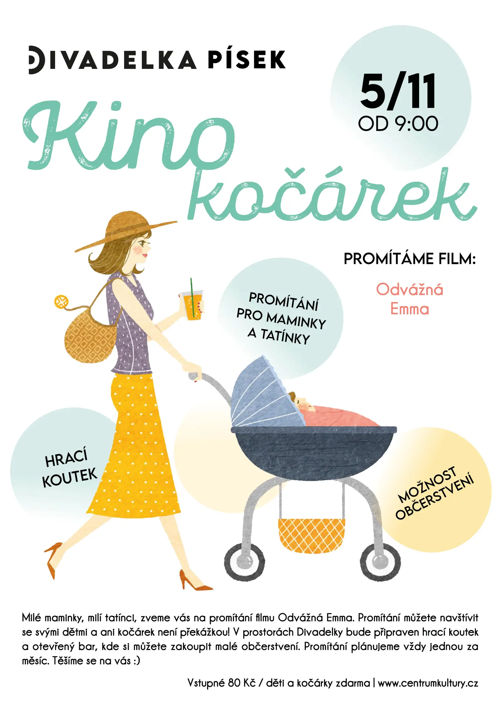 Milé maminky, milí tatínci, zveme vás do Divadelky na promítání rodinného animovaného filmu Odvážná Emma. Promítání se můžete zúčastnit i se svými dětmi a ani kočárek není překážkou! V prostorách Divadelky je pro ty nejmenší hrací koutek, ve kterém máme připravené židličky a další hračky. Pro rodiče bude otevřený bar, kde si můžete zakoupit malé občerstvení. Promítání je vždy jednou za měsíc. Těšíme se na vás.