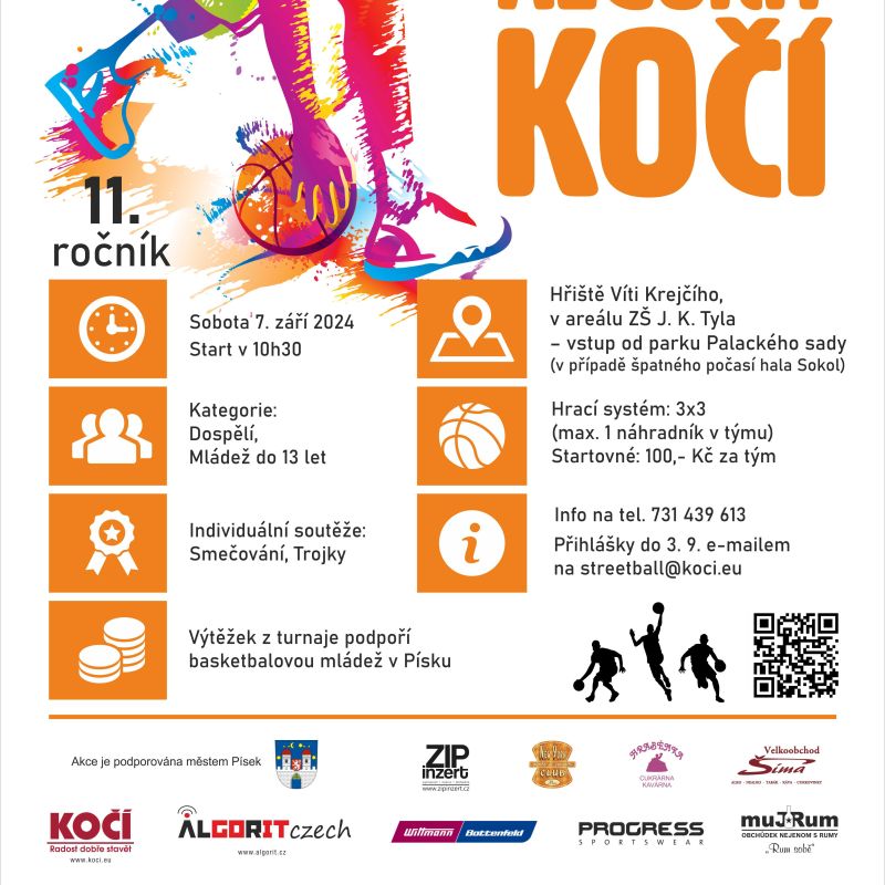 Aktuality sledujte na www.koci.eu/streetball-cup-2024/, www.algorit.cz, či na fb Kočí Algorit streetball cup.