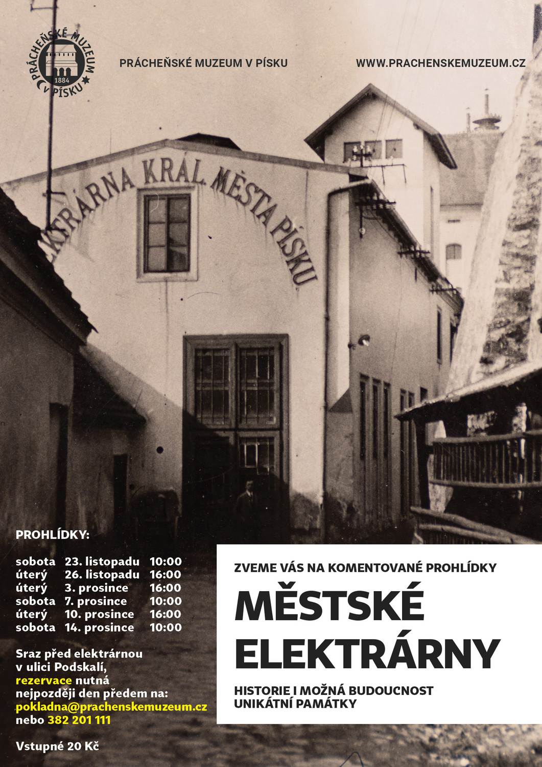 Komentované prohlídky začnou s přicházejícím jarem opět i v Městské elektrárně. O její minulosti a možné budoucnosti se dozvíte od historiků Jana Kouby a Bohumíra Bernáška, sraz na prohlídku je vždy v ulici Podskalí před elektrárnou, je třeba se nejpozději den předem registrovat na pokladně muzea na telefonu 382 201 111. Termíny jsou: sobota 8. 3. od 10 hodin a úterý 18. 3. od 16 hodin, v dubnu budou následovat čtyři další.