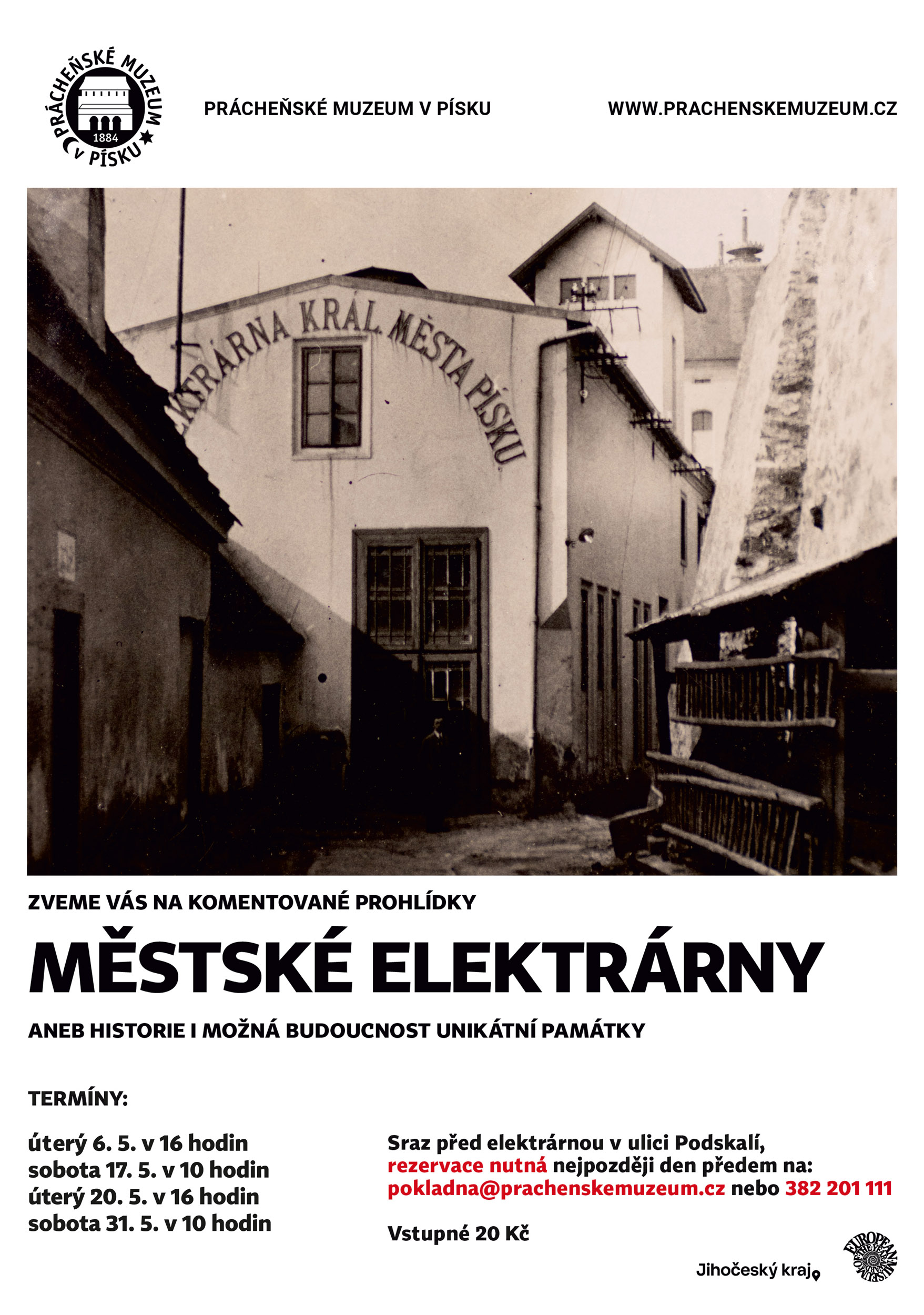 Komentované prohlídky v Městské elektrárně pojednávají o její minulosti a možné budoucnosti. Mnoho zajímavostí se dozvíte od historiků Jana Kouby a Bohumíra Bernáška, sraz na prohlídku je vždy v ulici Podskalí před elektrárnou, je třeba se nejpozději den předem registrovat na pokladně muzea nebo na telefonu 382 201 111. Květnové termíny jsou: úterky 6. 5. a 20. 5. od 16 hodin, soboty 17. 5. a 31. 5. od 10 hodin.