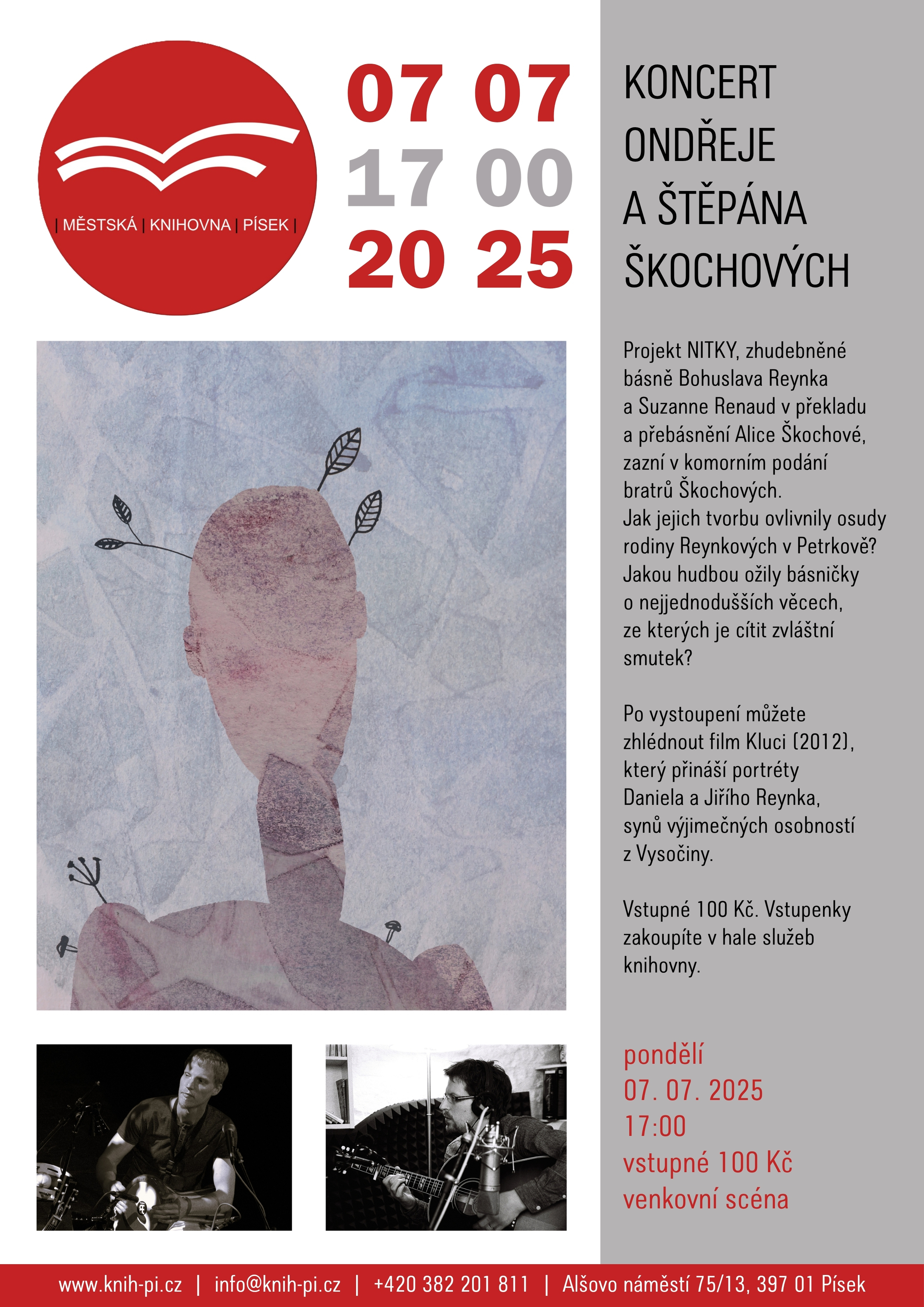 Projekt NITKY, zhudebněné básně Bohuslava Reynka a Suzanne Renaud v překladu a přebásnění Alice Škochové, zazní v komorním podání bratrů Škochových. Jak jejich tvorbu ovlivnily osudy rodiny Reynkových v Petrkově? Jakou hudbou ožily básničky o nejjednodušších věcech, ze kterých je cítit zvláštní smutek? Po vystoupení můžete zhlédnout film Kluci (2012), který přináší portréty Daniela a Jiřího Reynka, synů výjimečných osobností. Vstupné 100 Kč. Vstupenky zakoupíte v hale služeb.