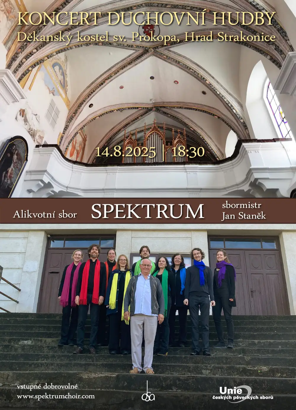 Přijďte si poslechnout unikátní pěvecký sbor z Prahy, který přináší do klasického sborového zpívání dosud příliš neprobádaný rozměr – techniku alikvotního zpěvu. Ta umožňuje vytvořit mimořádný a krásný sborový zvuk, který je velmi svébytný a těžko s něčím srovnatelný. Mezi ostatními alikvotními sbory je Spektrum unikátní právě tím, že spojuje klasický sborový zpěv s alikvotním. Je jediným sborem tohoto druhu v České republice a jedním z mála na světě.