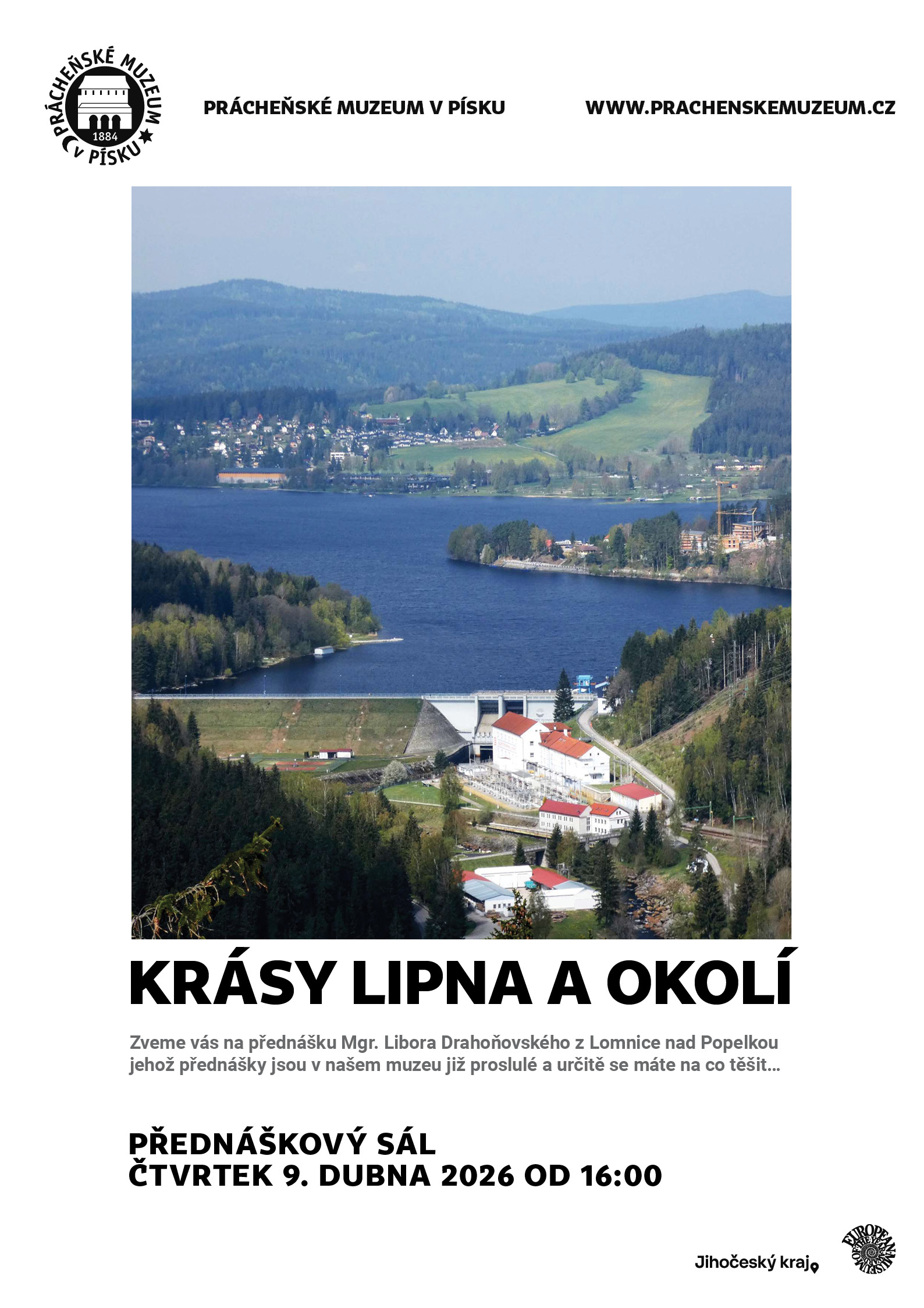 Cestovatelská přednáška v Prácheňském muzeu tentokrát zavede publikum jenom kousek od domova. Ve čtvrtek 9. dubna cestovatel Libor Drahoňovský nabídne besedu s promítáním fotografií z Lipenska. Řeč bude o malebných městečcích, na fotografiích přednášející ukáže působivé výhledy do malebné krajiny, skalní útvary, kamenné moře Čertovu stěnu, nejkrásnější úseky Schwarzenberského kanálu, klášter ve Vyšším Brodě či Vítkův kámen, který je nejvýše položenou hradní zřícenu v Čechách. Nevynechá ani pozůstaty vodní elektrárny Spiro, v době svého založení bezkonkurenčně největší v celém Rakousku-Uhersku, zaniklou papírnu v Loučovicích, druhou nejstarší elektrifikovanou železnici u nás a v neposlední řadě samozřejmě samotnou přehradní nádrž Lipno. Neopomine ani tamní zaniklé vsi, které byly po 2. světové válce vysídleny a záměrně zničeny v souvislosti s vytvořením zakázaného hraničního pásma.