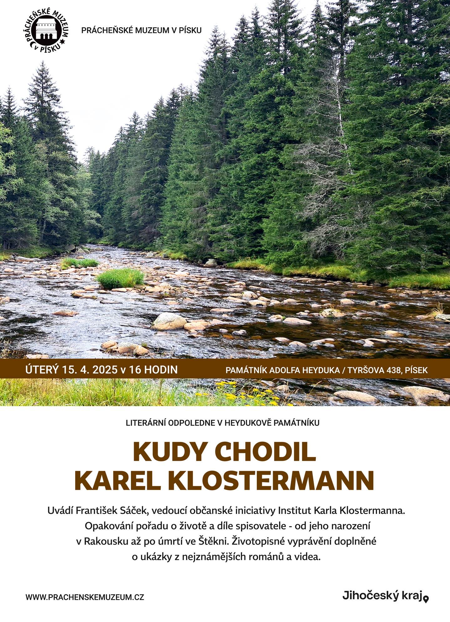 Pro velký zájem bude v úterý 15. 4. od 16 hodin zopakována přednáška Františka Sáčka, vedoucího občanské iniciativy Institut Karla Klostermanna. Písečtí zkrátka chtějí vědět, Kudy chodil Karel Klostermann a to jim přednášející řekne a doplní o videoukázky i úryvky z děl autora. Pořad se koná v Památníku Adolfa Heyduka v Tyršově ulici.