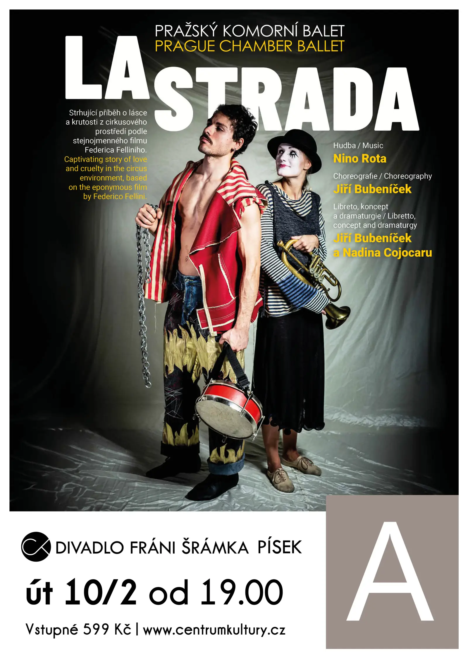 Tanečník a choreograf Jiří Bubeníček vytvořil pro Pražský komorní balet celovečerní baletní inscenaci, která zkoumá složitý vztah mezi nevinnou a laskavou Gelsominou a hrubým kočovným cirkusákem Zampanem. Představení sleduje jejich bouřlivý vztah během putování po Itálii, odhaluje dojemnou cestu Gelsominy a proměnu Zampanových citů pod jejím vlivem. Dokonalá choreografie propojuje klasický a moderní taneční jazyk, přičemž každý pohyb vypráví příběh beze slov a proměňuje je v nezapomenutelný vizuální a emocionální zážitek.