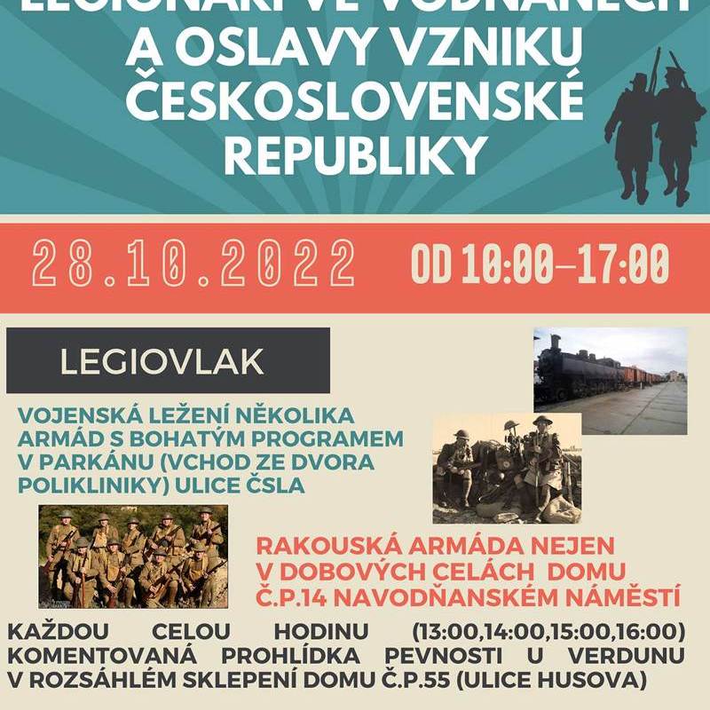 Knihovna Gelasta Vodňanského ve spolupráci s Klubem vojenské historie ČB, Československou obcí legionářskou a dalšími kluby obsadí 28.10.2022 s několika dobovými armádami dosud nepřístupná místa ve městě. Návštěvníci se mohou těšit vedle Legiovlaku také na polní ležení čtyř spojeneckých armád v parkánu u polikliniky (ulice ČSLA), ukázku života v zákopech, či všední den vojáků. K vidění budou uniformy, zbraně, zdravotnictví, věci každodenního života, ale také polní kuchyně, kde si budou vojáci vařit jídlo po celý den akce. Dobové cely i přilehlý dvorek domu č.p. 14 na náměstí bude obsazen Rakousko-Uherskou armádou. Návštěvníci se mimo to mohou těšit i na prvoválečnou motorku, nebo kancelář velení.