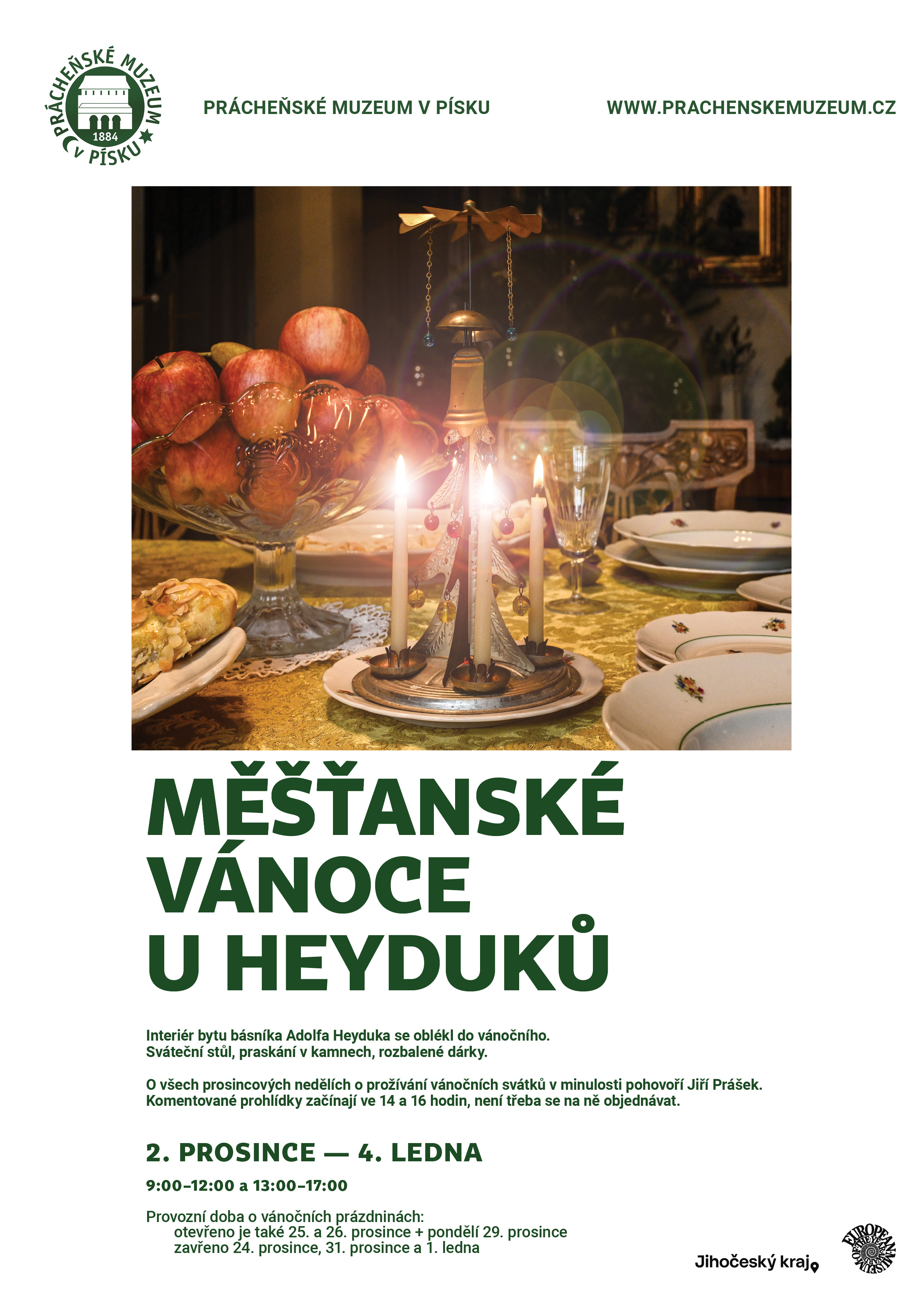 Před plánovanou rekonstrukcí se do vánočního oblékl interiér bytu básníka Adolfa Heyduka. V jídelně najdete prostřený sváteční stůl, rozbalené dárky, samozřejmě také ozdobený stromeček a další vánoční nezbytnosti. O všech prosincových nedělích (7., 14., 21., 28. 12.) navíc o prožívání vánočních svátků ve městě i na venkově v době před sto lety pohovoří bývalý ředitel muzea Jiří Prášek na komentovaných prohlídkách. Začátky budou vždy ve 14 a 16 hodin, na prohlídky se není třeba objednávat. Ve všední dny a o sobotách bude rovněž možné nasát vánoční atmosféru s průvodkyní.