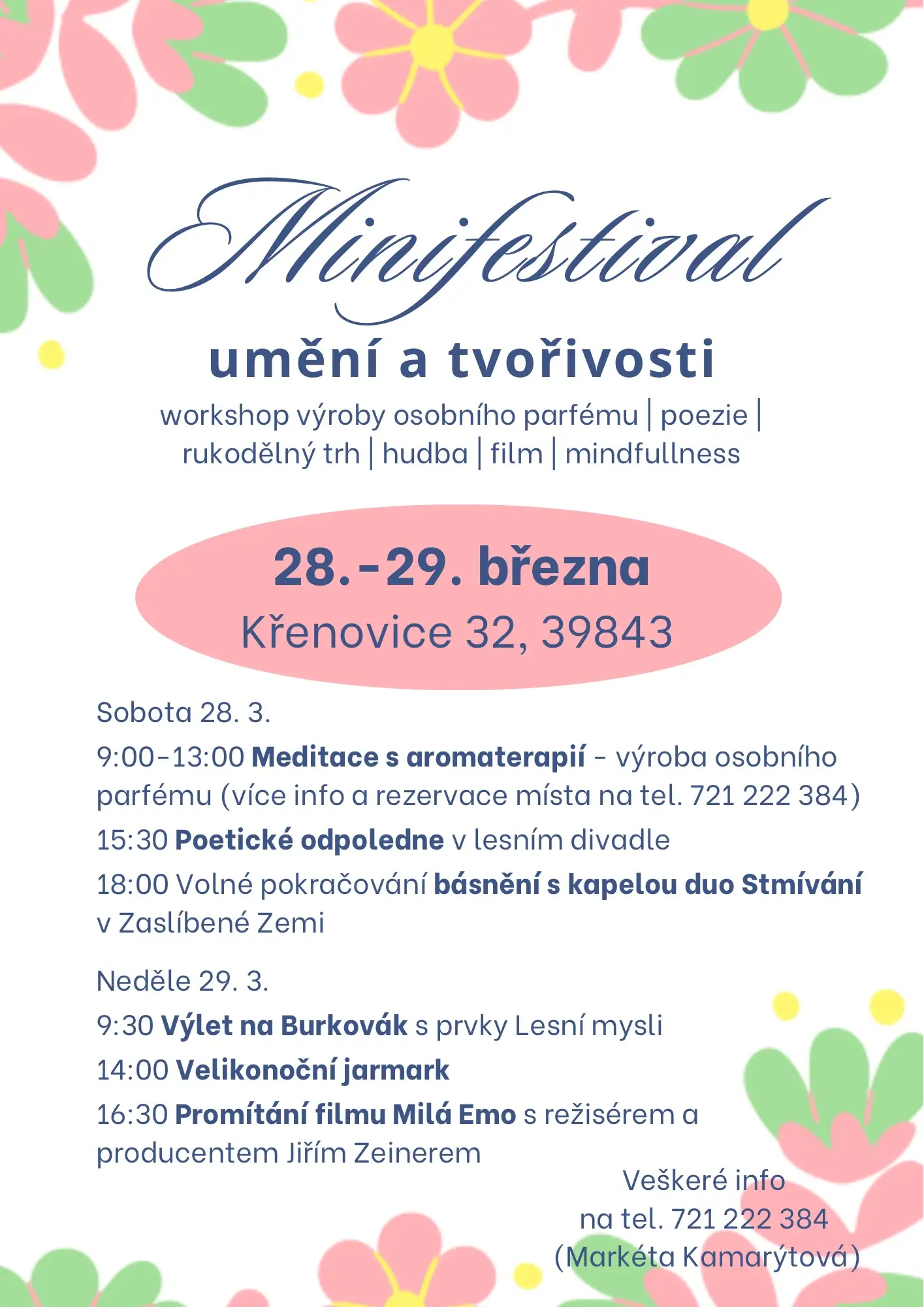 Rezervace místa dopředu (prosíme nejpozději do 21. 3.) je nutná na tel. 721 222 384 nebo zde přes fb. Provází Markéta Kamarýtová a Veronika Bekrová