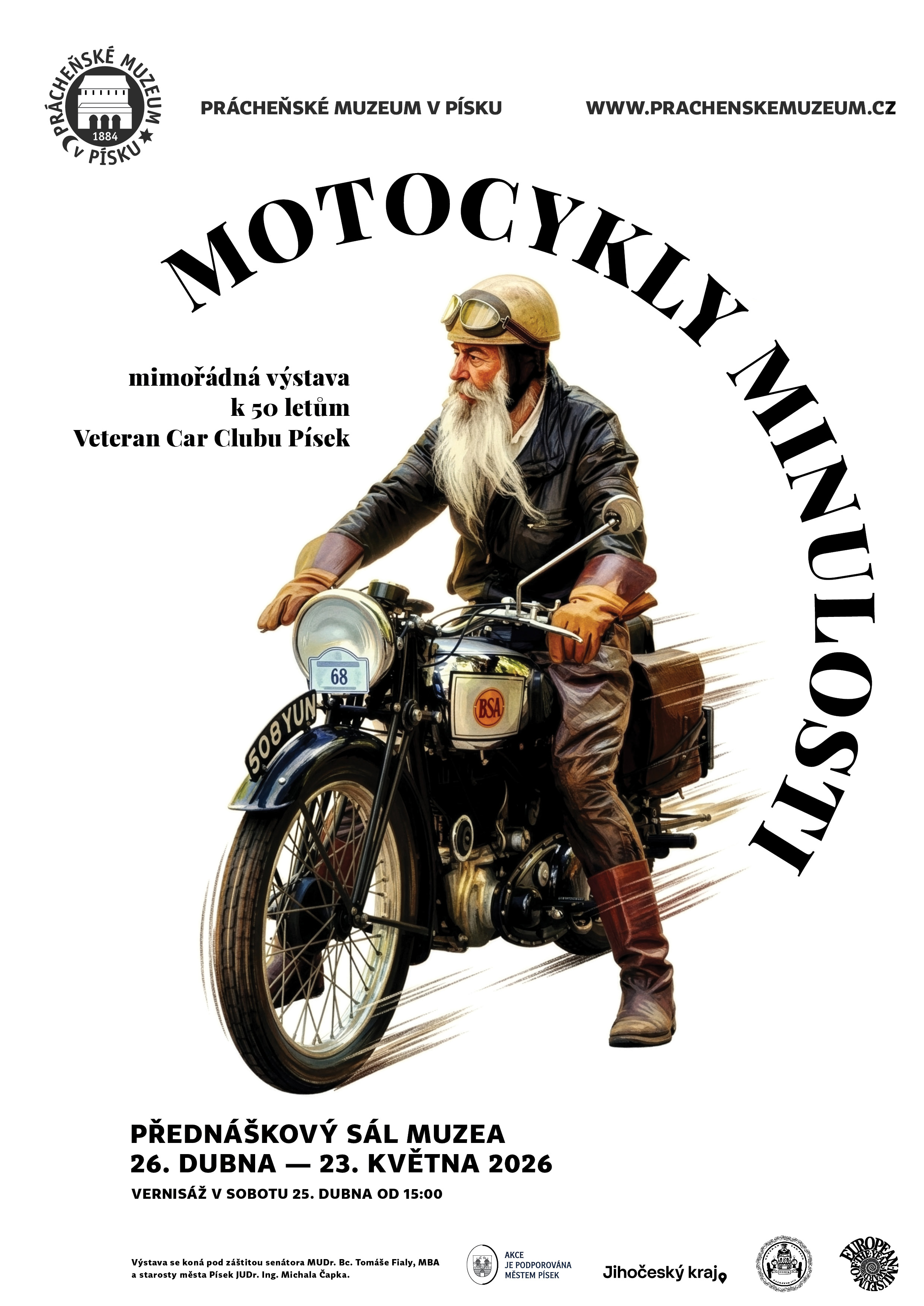Výstava Motocykly minulosti bude k vidění od 25. 4. do 23. 5. v přednáškovém sále Prácheňského muzea, kam se vstupuje přes zadní nádvoří bývalé obchodní akademie. Připomene 50 let činnosti Veteran Car Clubu Písek a představí veřejnosti svět historických motocyklů i práci nadšenců, kteří je s péčí a obdivuhodnou trpělivostí vracejí zpět do života. Návštěvníci uvidí výběr renovovaných motocyklů z různých období i ukázky klubové činnosti, která dlouhodobě přispívá k uchovávání technického dědictví a připomíná slavnou éru československého motocyklového průmyslu. Výstava chce oživit vzpomínky pamětníků na stroje, které kdysi patřily k běžné součásti života, a zároveň přiblížit krásu historických motorek i mladší generaci.