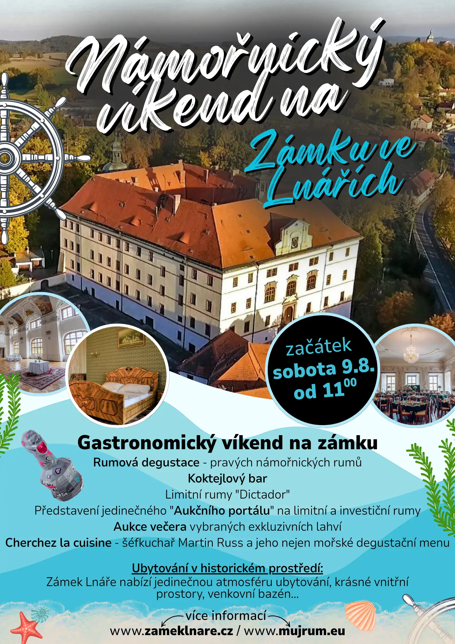 V sobotu 9. srpna 2025 se Zámek ve Lnářích přemění na krásné místo plné skvělých rumů nejen z Karibiku, úžasných koktejlů a lahodné gastronomie. Také na Vás bude čekat degustace "Námořnických" rumů s příběhy od muJRum Písek, prezentace limitních rumů Dictador z Kolumbie od Petera Szullo. Po celý den vám bude podávat lahodné pokrmy šéfkuchař Martin Russ se svojí partou a připraví si i pěkné večerní grilování. K parádnímu pokrmu patří parádní pivo, to nám zajistí "Pivovar Čížová" a bude další příležitost ochutnat historicky první pivo v ČR s macerací jamajského rumu Appleton. Představíme nový "Aukční portál" na limitní láhve, které se budete mít možnost i zakoupit. Bude i odpolední pořad pro děti a večerní soutěž o krásnou láhev skvělého rumu. K poslechu a k tanci nás celý čas bude doprovázet hudební společnost Steel Duckies – živé muzicírování na nádvoří.