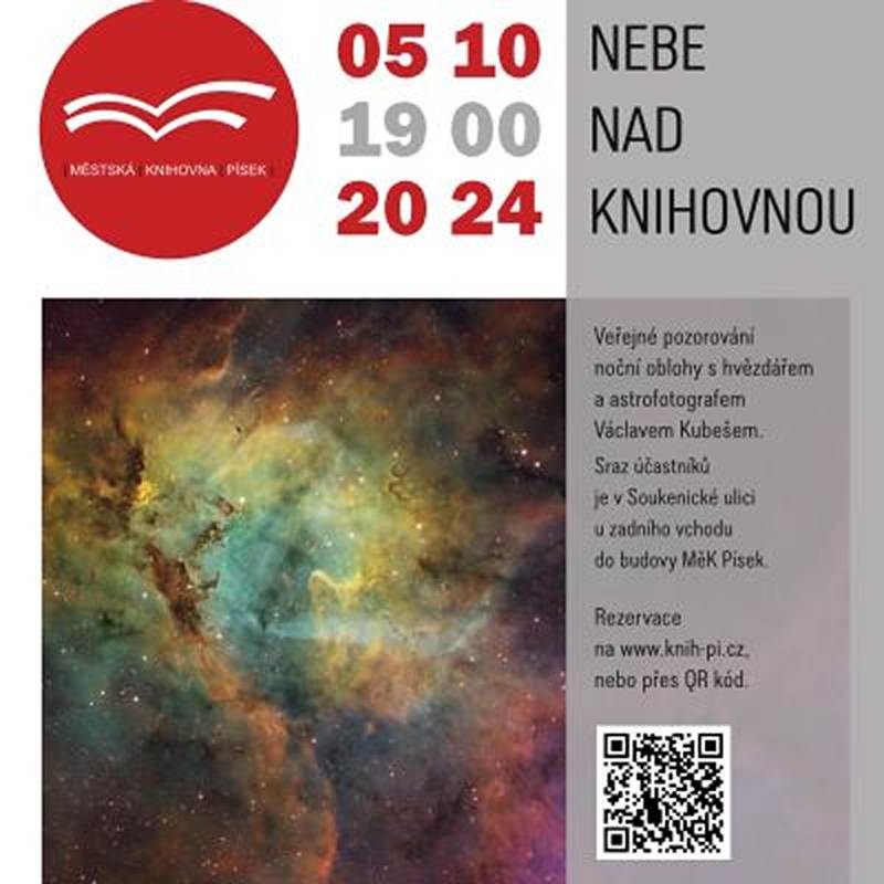 Veřejné pozorování noční oblohy s hvězdářem a astrofotografem Václavem Kubešem. Sraz účastníků je v Soukenické ulici u zadního vchodu do budovy MěK Písek. Rezervace nutná.
