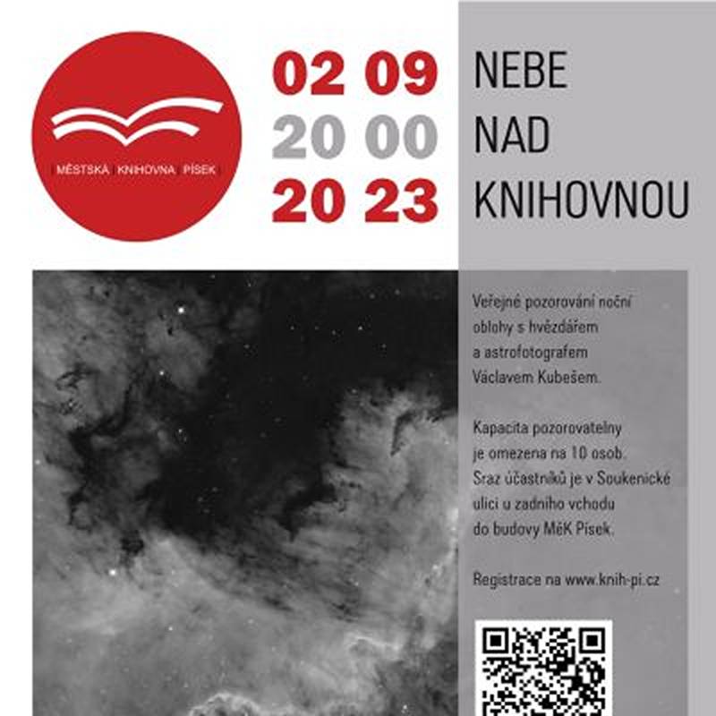 Veřejné pozorování oblohy s hvězdářem a astrofotografem Václavem Kubešem. Sraz účastníků na parkovišti u zadního vchodu knihovny (ulice Soukenická). Kapacita 10 osob. Registrace přes rezervační systém nutná (viz web akce).