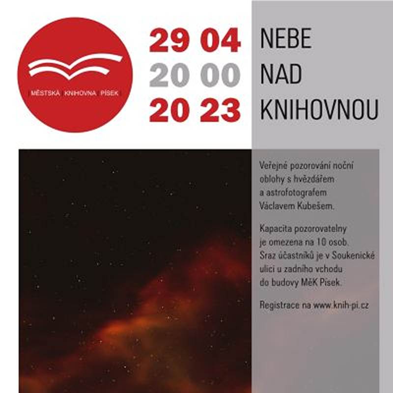 POZOR! Vstup pouze po předešlé rezervaci. Kapacita pozorovatelny je omezena na 10 účastníků. Vstup ze Soukenické ulice u zadního vchodu do budovy MěK Písek. Prosíme dbejte pokynů personálu MěK Písek. Děkujeme.