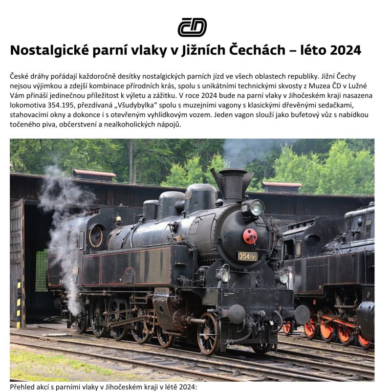 České dráhy pořádají každoročně desítky nostalgických parních jízd ve všech oblastech republiky. Jižní Čechy nejsou výjimkou a zdejší kombinace přírodních krás, spolu s unikátními technickými skvosty z Muzea ČD v Lužné Vám přináší jedinečnou příležitost k výletu a zážitku. V roce 2024 bude na parní vlaky v Jihočeském kraji nasazena lokomotiva 354.195, přezdívaná „Všudybylka“ spolu s muzejními vagony s klasickými dřevěnými sedačkami, stahovacími okny a dokonce i s otevřeným vyhlídkovým vozem. Jeden vagon slouží jako bufetový vůz s nabídkou točeného piva, občerstvení a nealkoholických nápojů.