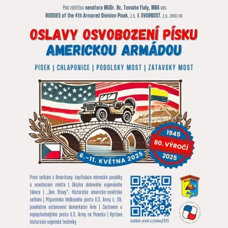 BUDDIES of the 4th Armored Division Písek a SVORNOST vás hrdě zvou na oslavy 80. výročí OSVOBOZENÍ PÍSKU AMERICKOU ARMÁDOU! Přijďte s námi uctít hrdinství, které navždy změnilo historii našeho města.
