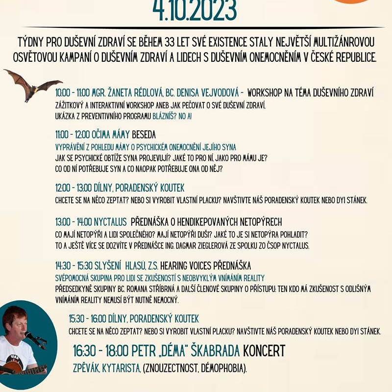 Společně zažijeme workshop o duševním zdraví, vyprávění mámy o psychických obtížích jejího syna, zbavíme se předsudků o netopýrech, kteří za námi osobně přiletí, poslechneme si přednášku svépomocné skupiny Slyšení hlasů, z.s. a na závěr si užijeme koncert Petra,,Démy" Škabrady.