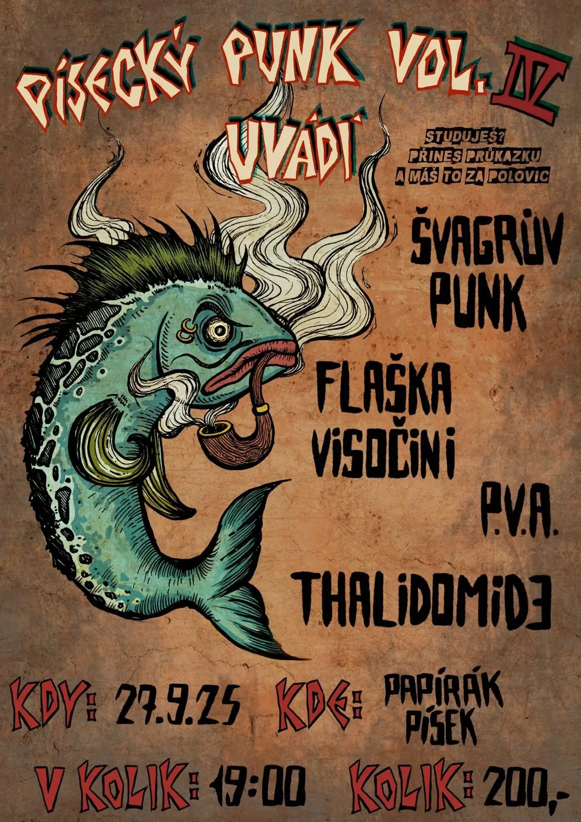 Vystoupí kapely: Thalidomide, P.V.A., Flaška Visočini a Švagrův Punk, takže se fakt máte na co těšit.