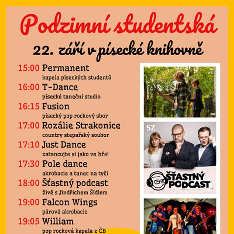 Besedy, workshopy, hudební i taneční vystoupení (Fusion, Permanent, Tvoje máma, William, Red Moon Sand, T-Dance, Falcon Wings, Rozálie Strakonice, Pole dance, Just dance). Těšit se můžete i na Jindřicha Šídla a Konstantina Sulimenka ze Šťastného pondělí a Šťastného podcastu.
