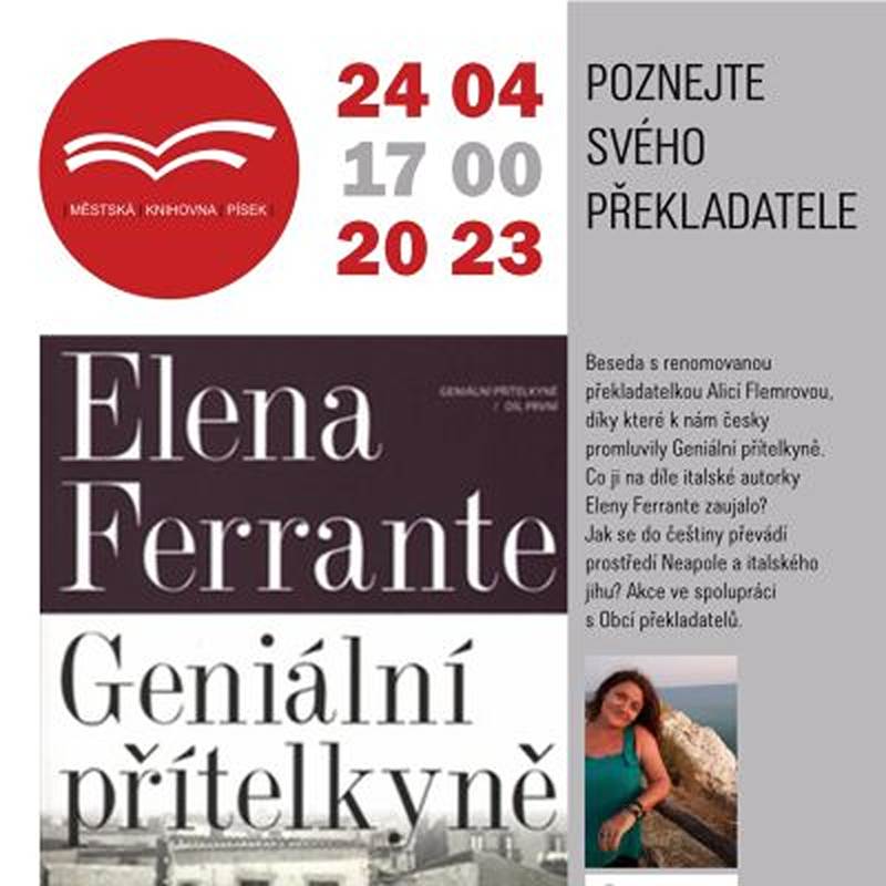 Beseda s renomovanou překladatelkou Alicí Flemrovou, díky které k nám česky promluvily Geniální přítelkyně. Co ji na díle italské autorky Eleny Ferrante zaujalo? Jak se do češtiny převádí prostředí Neapole a italského jihu? Akce ve spolupráci s Obcí překladatelů. / sál