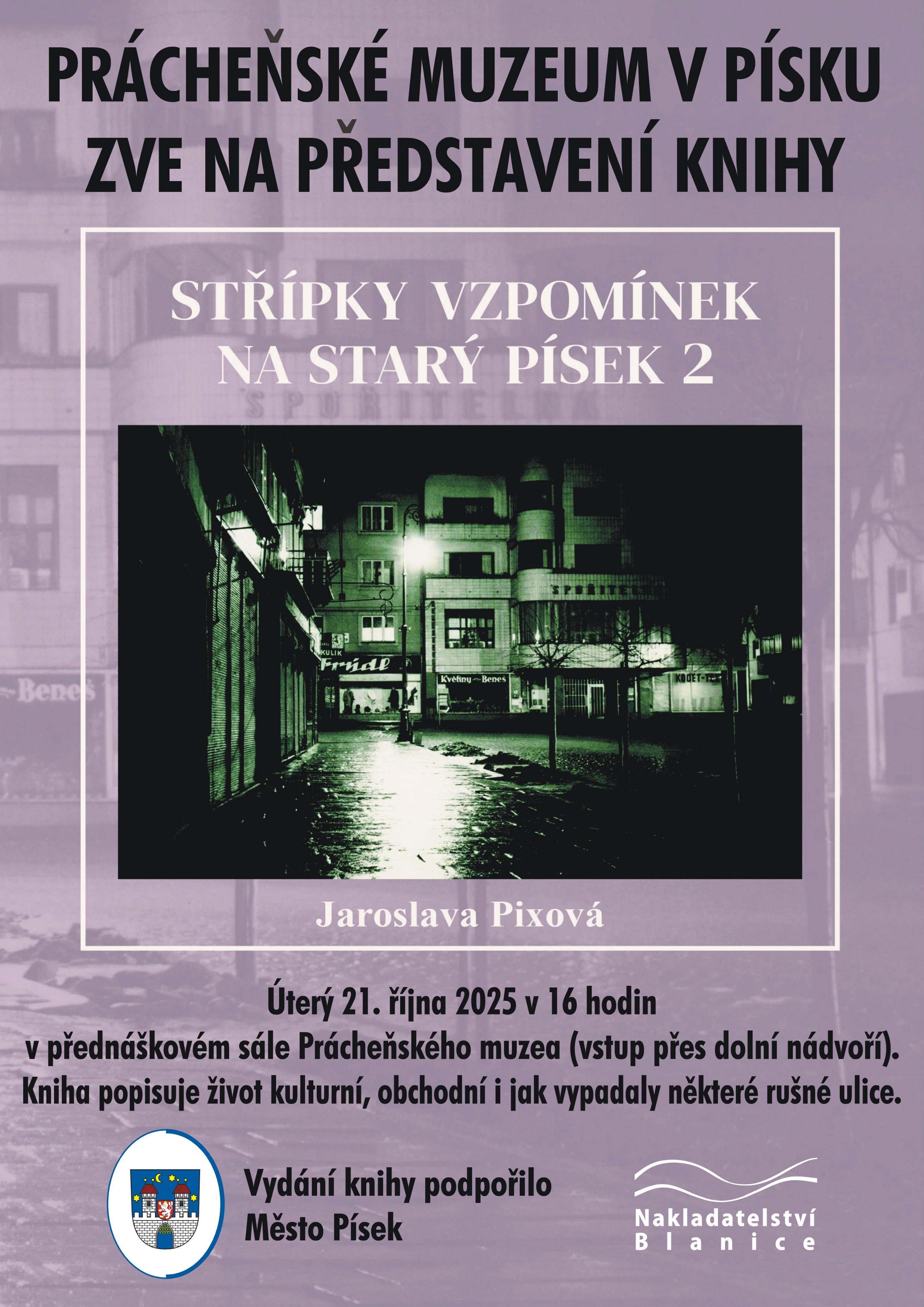 Prácheňské muzeu v Písku hostí křest nové knihy Jaroslavy Pixové. Druhý díl publikace Střípky vzpomínek na starý Písek uvede autorka a Jiří Prášek, vzpomínat se bude na život kulturní a obchodní. Slavnostní uvedení nové publikace se koná v přednáškovém sále v úterý 21. října od 16 hodin.
