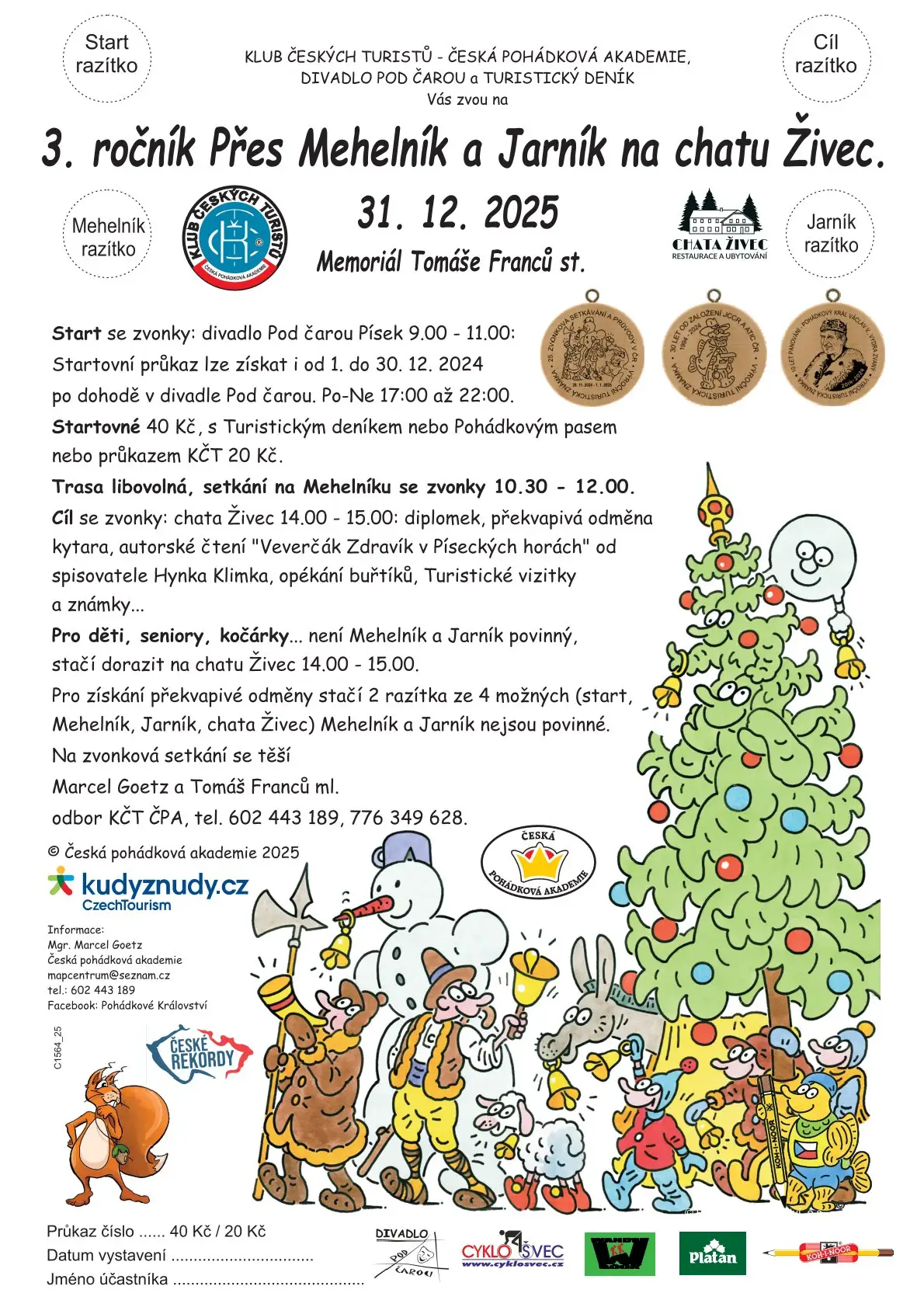 Startovné 40 Kč, s Turistickým deníkem, Pohádkovým pasem nebo průkazem KČT 20 Kč.