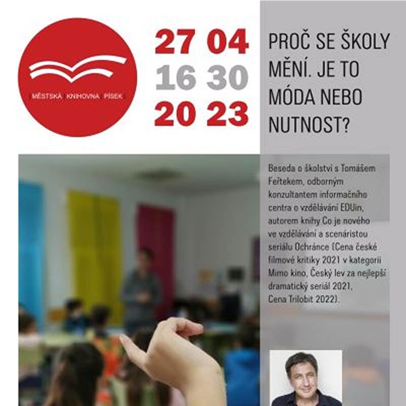 Beseda o školství s Tomášem Feřtekem, odborným konzultantem informačního centra o vzdělávání EDUin, autorem knihy Co je nového ve vzdělávání a scenáristou seriálu Ochránce (Cena české filmové kritiky 2021 v kategorii Mimo kino, Český lev za nejlepší dramatický seriál 2021, Cena Trilobit 2022).