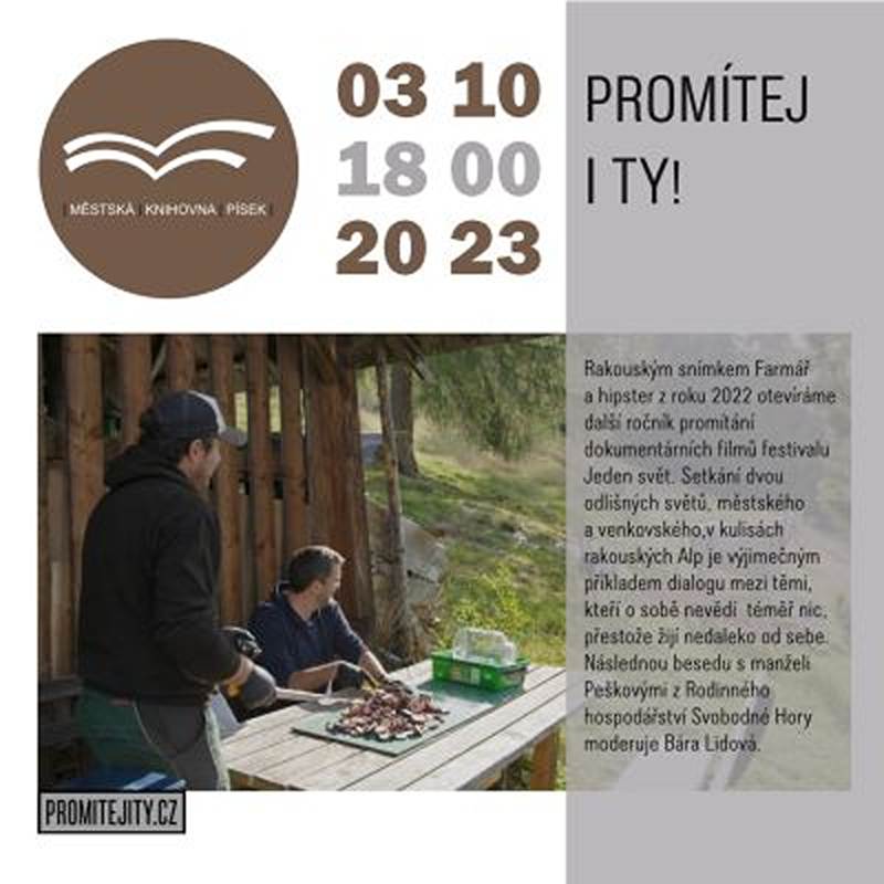 Rakouským snímkem Farmář a hipster z roku 2022 otevíráme další ročník promítání dokumentárních filmů festivalu Jeden svět. Setkání dvou odlišných světů, městského a venkovského, v kulisách rakouských Alp je výjimečným příkladem dialogu mezi těmi, kteří o sobě nevědí téměř nic, přestože žijí nedaleko od sebe. Následnou besedu moderuje Bára Lidová.